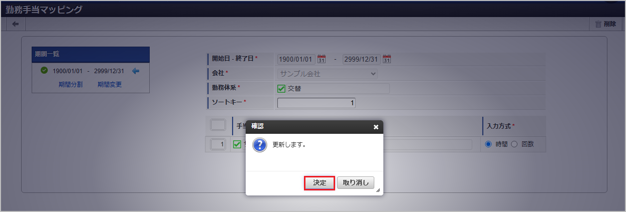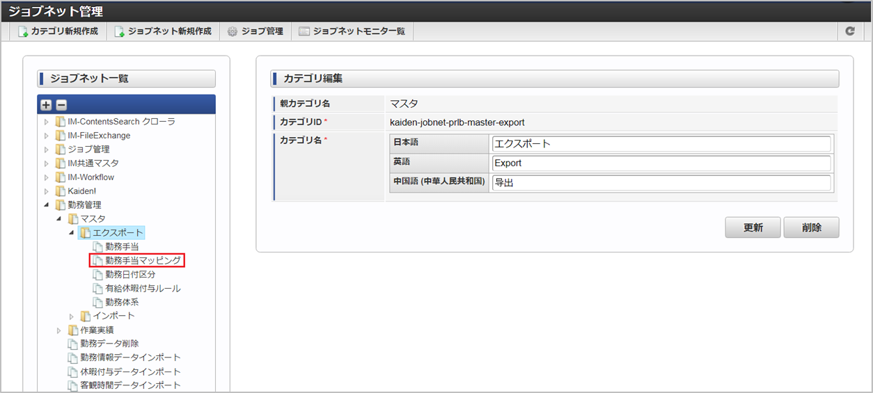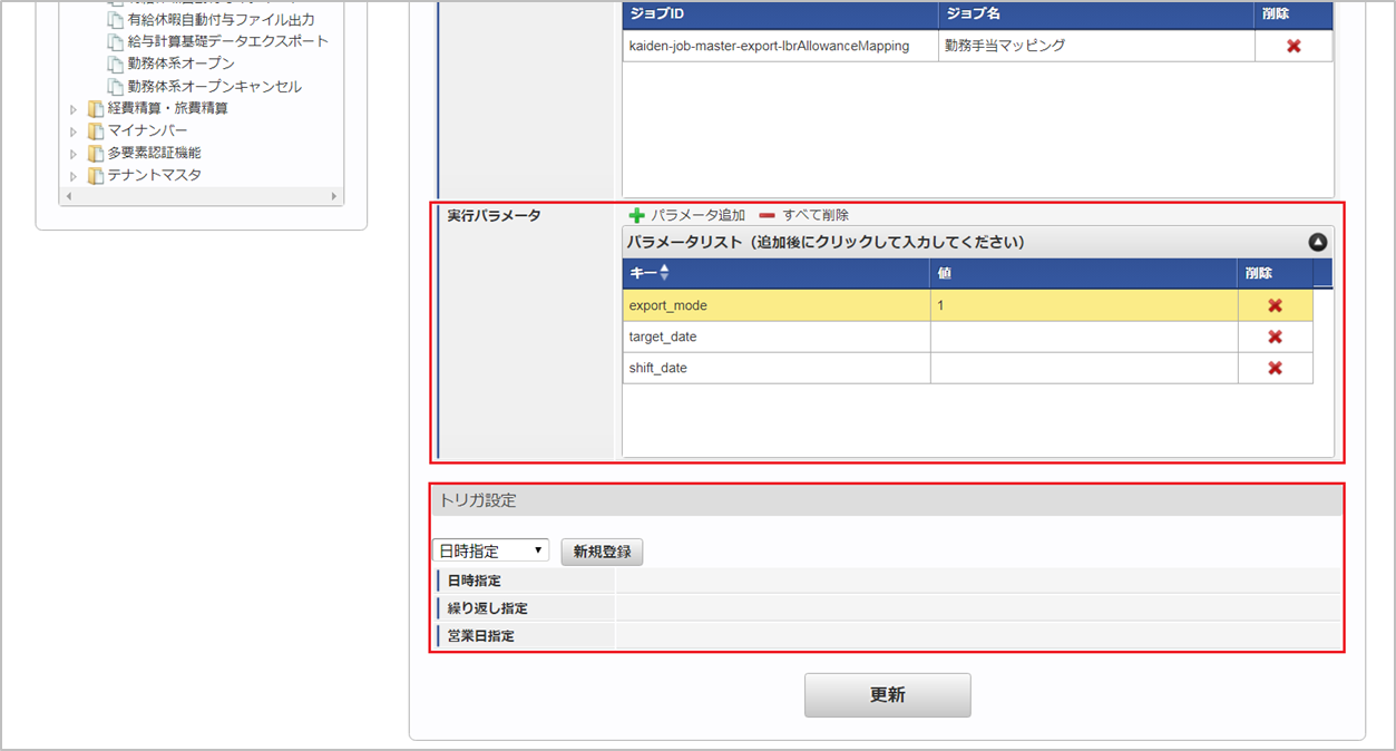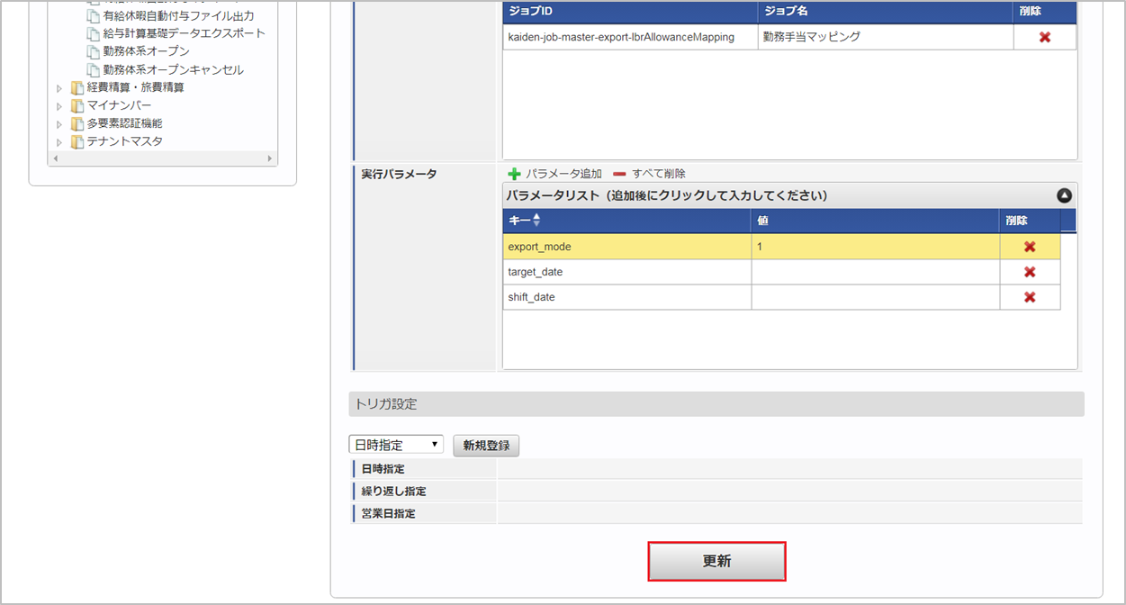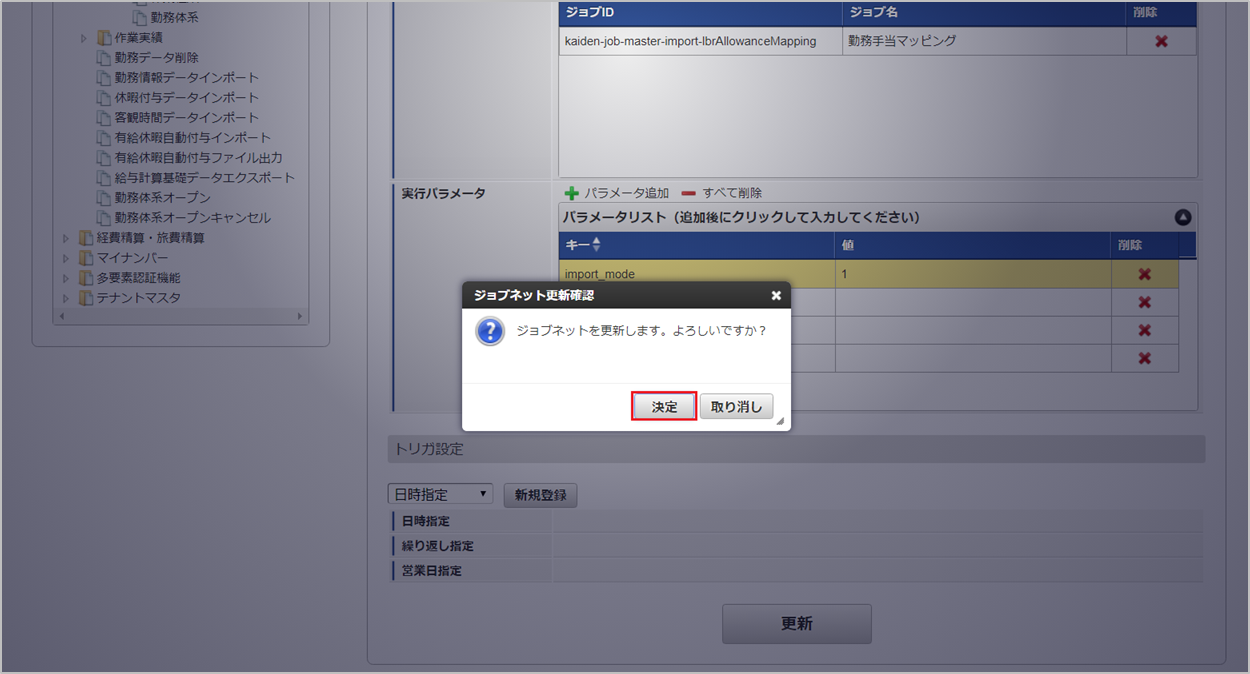 ジョブID ジョブ名(ジョブ選択時のツリー) kaiden-job-master-export-lbrAllowanceMapping 勤務管理 / マスタ / エクスポート / 勤務手当マッピング 編集後、「更新」をクリックします。 確認ポップアップの「決定」をクリックします。 ジョブネットが設定されました。