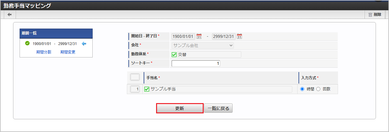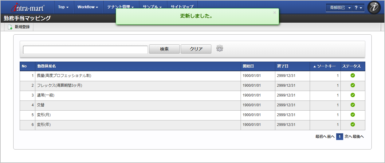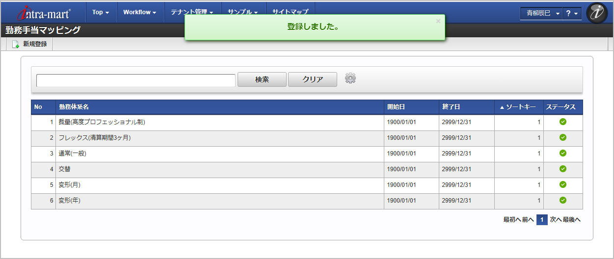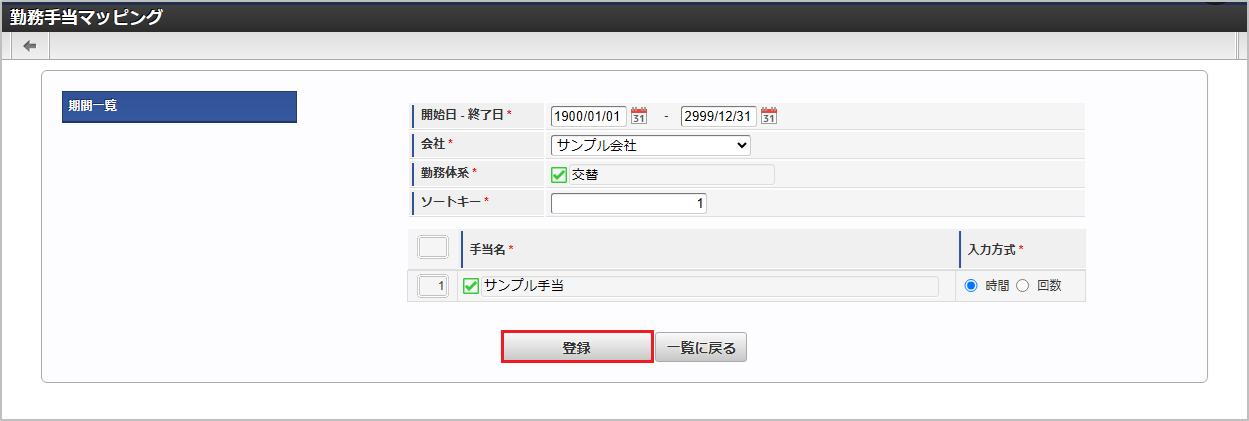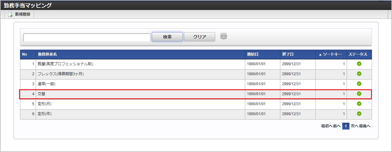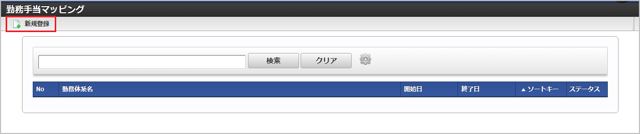 「サイトマップ」→「勤務管理」→「マスタメンテナンス」→「勤務手当マッピング」をクリックします。 一覧画面表示後、「新規登録」をクリックします。 登録/更新画面で必要な情報を入力し、「登録」をクリックします。