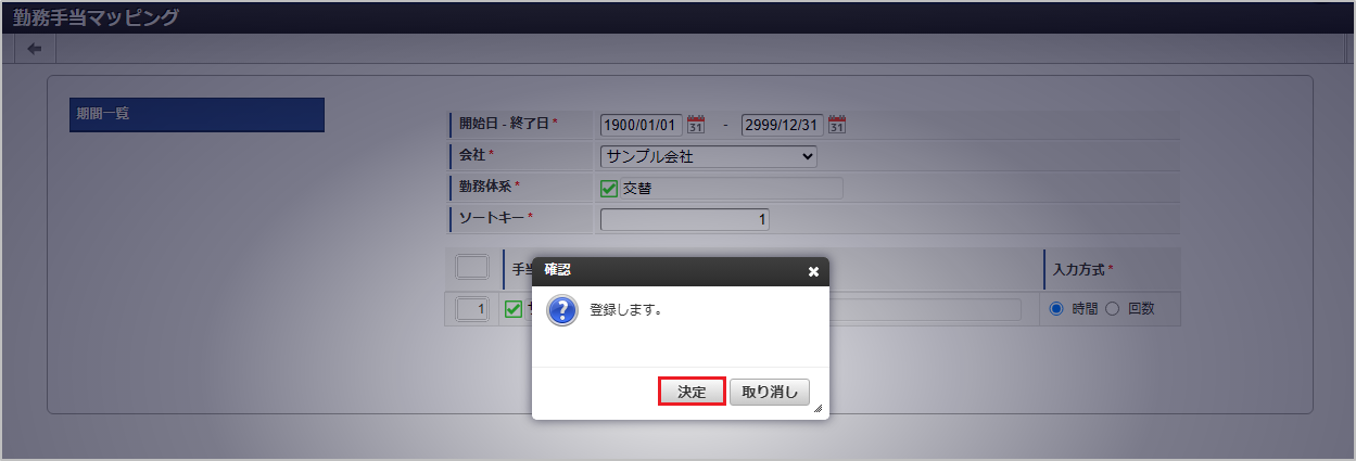 明細行の操作方法は、 明細行の操作 を参照してください。 確認ポップアップが表示されますので、「決定」をクリックします。 新規登録することができました。