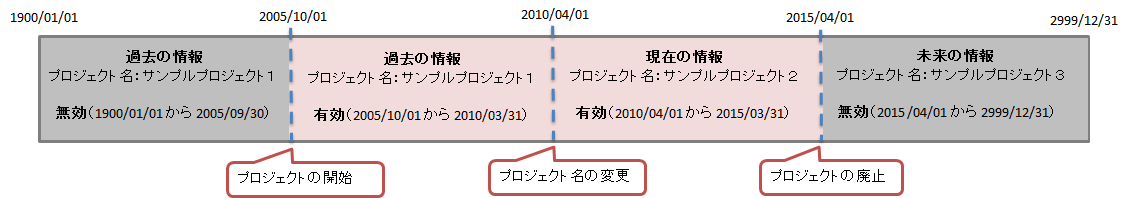 会社単位で管理するマスタintra-mart Accel Kaiden! のマスタの多くは会社単位で管理できます。「A社の申請書ではA社のマスタデータのみが利用できる」など、業務/処理を会社の単位で行います。 期間化情報を持つマスタ期間化情報とは、同一のマスタをある日付を境にして名称や属性などの情報を変更した変更情報(履歴)です。来年度から名称が変わる場合でも、今年度と来年度の両方の情報を保持することができます。また、ある日付を境に、マスタのステータス(有効/無効)を変化させることのできるものもあります。例えば、プロジェクトマスタに以下のような期間化情報を持たせることができます。システム有効期間の範囲で無効な期間化情報を補完してデータを保持します。 国際化情報を持つマスタ名称などの情報を複数ロケール(言語)分登録可能なマスタです。利用者のロケール設定で表示内容を切り替えることができます。 インポート可能なマスタ「ジョブスケジューラ」を利用して、マスタデータを一括して登録することができます。