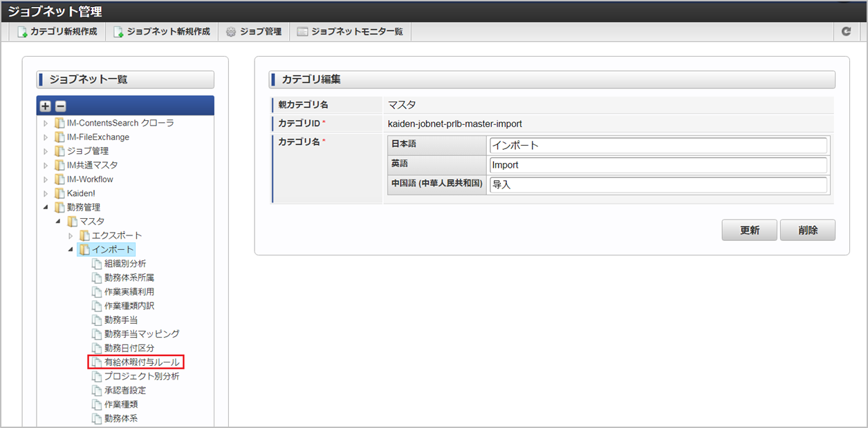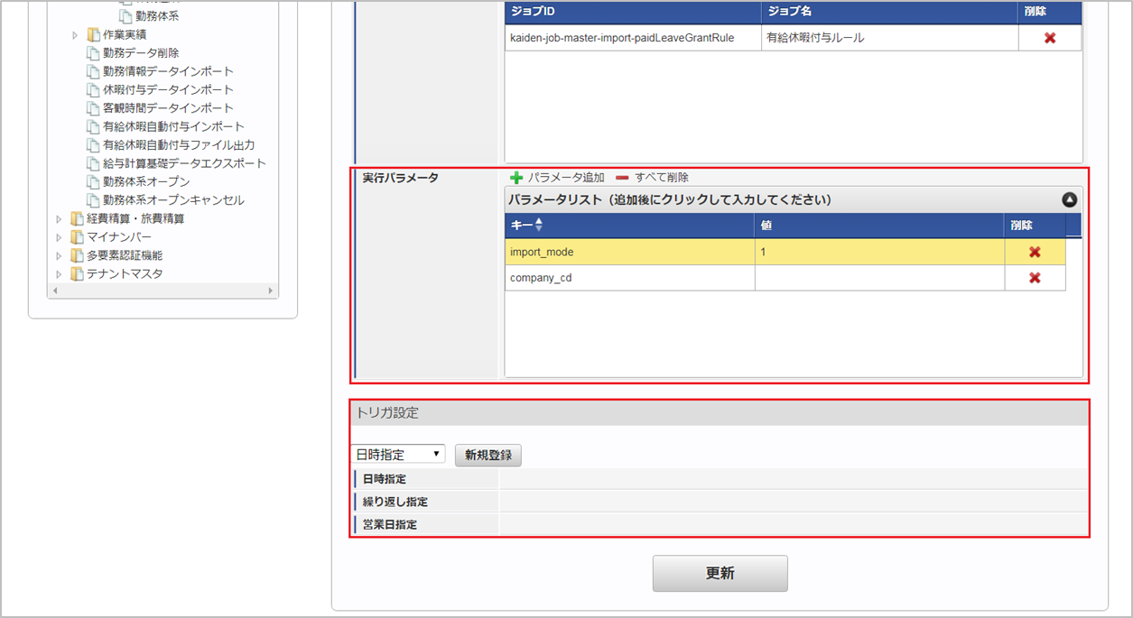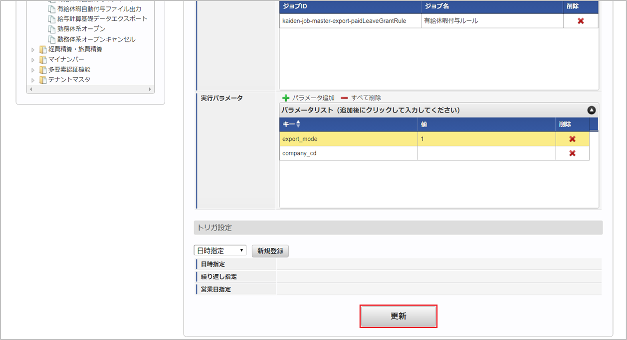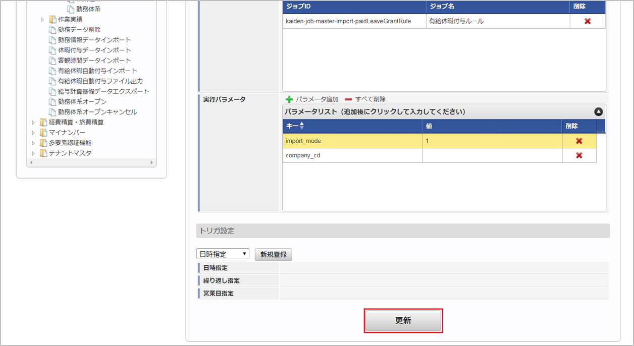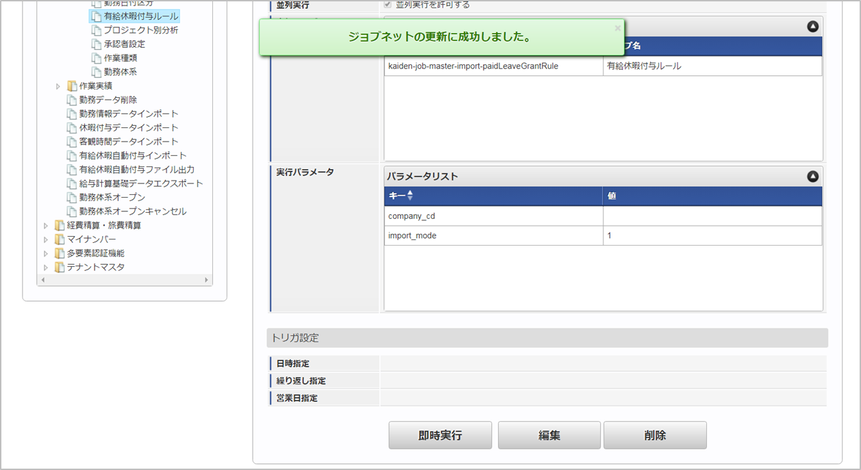 ジョブID ジョブ名(ジョブ選択時のツリー) kaiden-job-master-export-paidLeaveGrantRule 勤務管理 / マスタ / エクスポート / 有給休暇付与ルール 編集後、「更新」をクリックします。 確認ポップアップの「決定」をクリックします。 ジョブネットが設定されました。