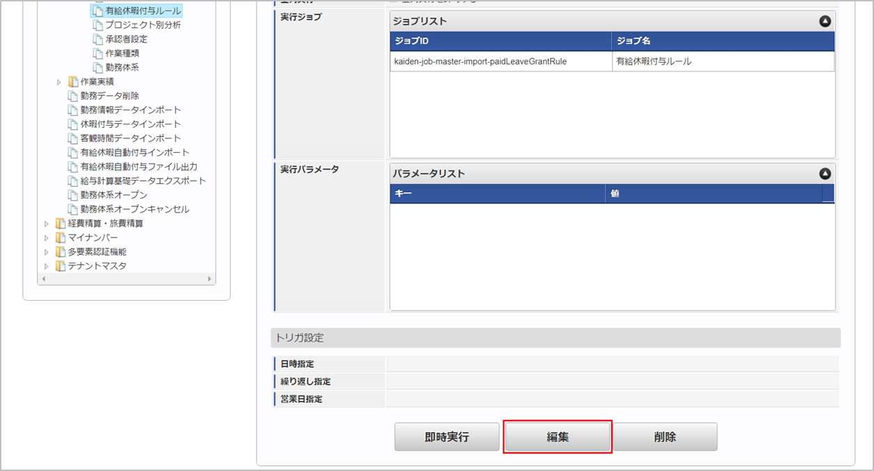 「サイトマップ」→「テナント管理」→「ジョブネット設定」をクリックします。 ジョブネット一覧(画面左部)の「有給休暇付与ルール」をクリックします。 「編集」をクリックします。 必要に応じて「実行パラメータ」、「トリガ設定」を編集します。コラム