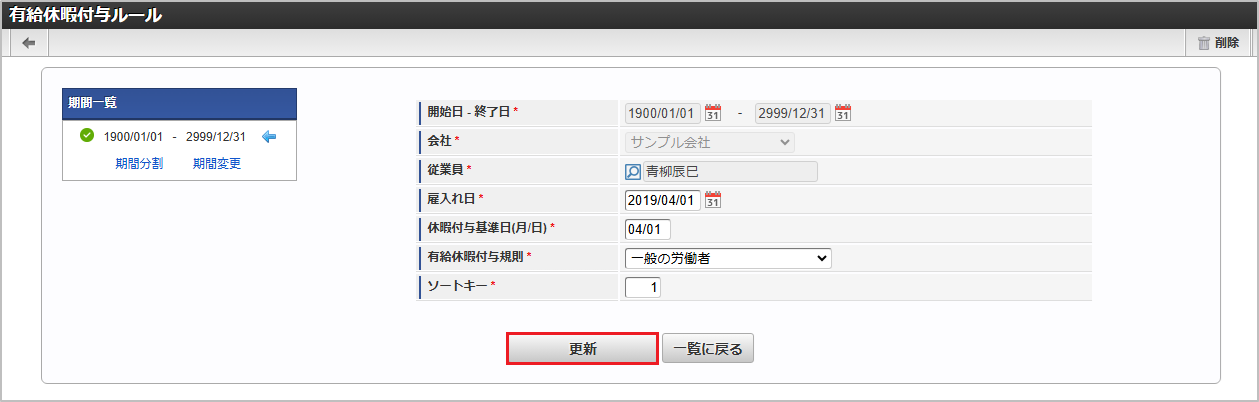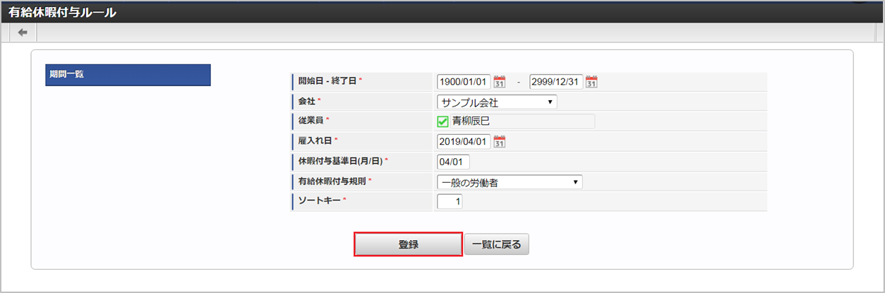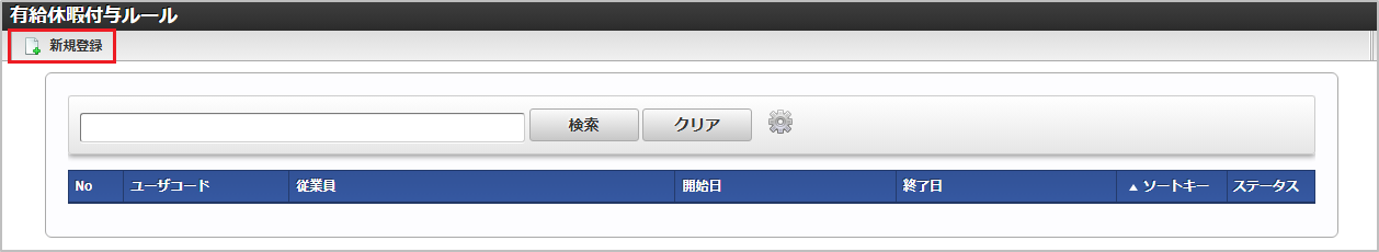 従業員従業員を選択します。 雇入れ日雇入れ日を入力します。 休暇付与基準日月/日の形式で付与日を入力します。 有給休暇付与規則従業員の雇用形態に従った有給休暇付与規則を選択します。 ソートキー画面の表示順を半角数字で入力します。表示順は昇順(値の小さい順)です。コラム