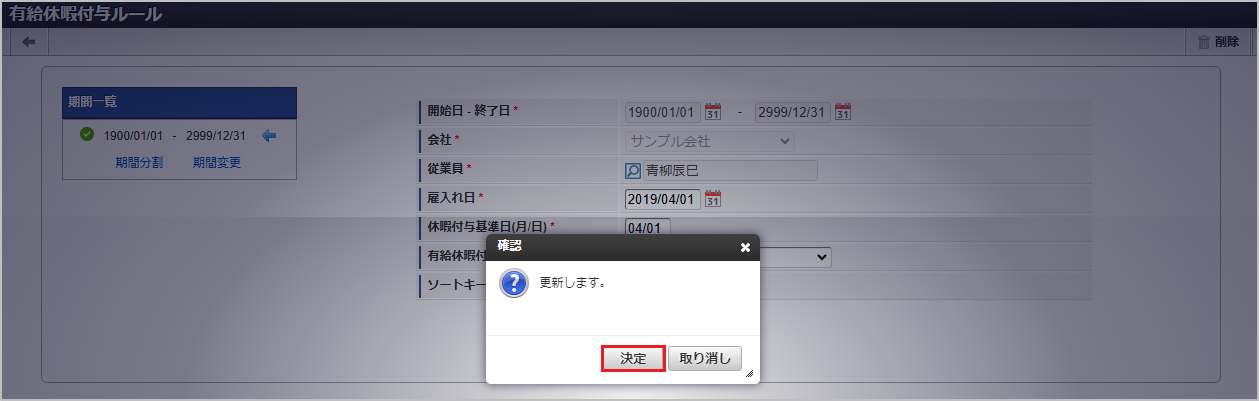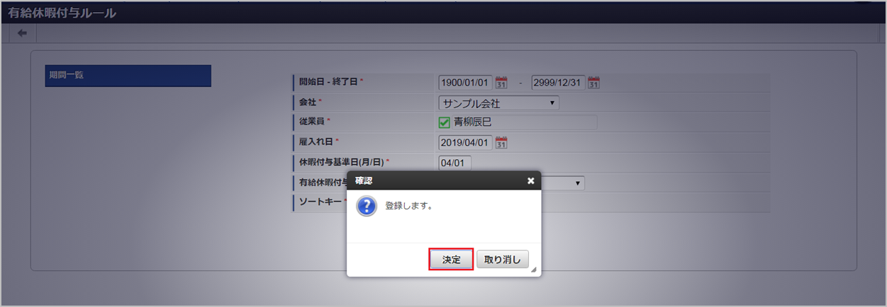 休暇付与ルール名 勤続年数 休暇付与日数 一般の労働者 0 (1年未満) 10日 1 (1年以上) 11日 2 (2年以上) 12日 3 (3年以上) 14日 4 (4年以上) 16日 5 (5年以上) 18日 6 (6年以上) 20日 パート(週所定労働日数4日) 0(1年未満) 7日 1 (1年以上) 8日 2 (2年以上) 9日 3 (3年以上) 10日 4 (4年以上) 12日 5 (5年以上) 13日 6 (6年以上) 15日 パート(週所定労働日数3日) 0(1年未満) 5日 1 (1年以上) 6日 2 (2年以上) 6日 3 (3年以上) 8日 4 (4年以上) 9日 5 (5年以上) 10日 6 (6年以上) 11日 パート(週所定労働日数2日) 0(1年未満) 3日 1 (1年以上) 4日 2 (2年以上) 4日 3 (3年以上) 5日 4 (4年以上) 6日 5 (5年以上) 6日 6 (6年以上) 7日 パート(週所定労働日数1日) 0(1年未満) 1日 1 (1年以上) 2日 2 (2年以上) 2日 3 (3年以上) 2日 4 (4年以上) 3日 5 (5年以上) 3日 6 (6年以上) 3日 上記に該当しない未成年 0(1年未満) 12日 1 (1年以上) 13日 2 (2年以上) 14日 3 (3年以上) 16日 4 (4年以上) 18日 5 (5年以上) 20日 6 (6年以上) 20日 確認ポップアップが表示されますので、「決定」をクリックします。 新規登録することができました。