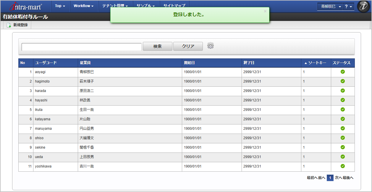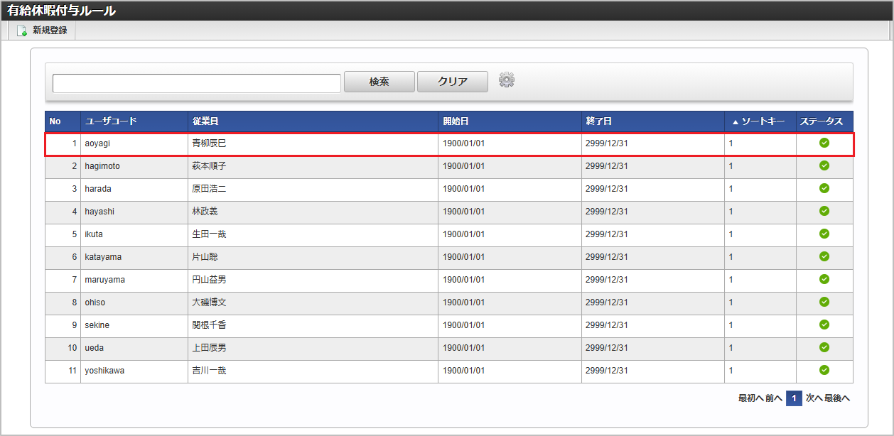 ユーザコード 従業員 一覧画面の対象データが表示されている行をクリックします。コラム