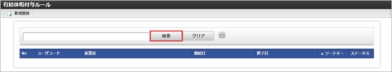 「サイトマップ」→「勤務管理」→「マスタメンテナンス」→「有給休暇付与ルール」をクリックします。 一覧画面で「検索」をクリックします。コラム