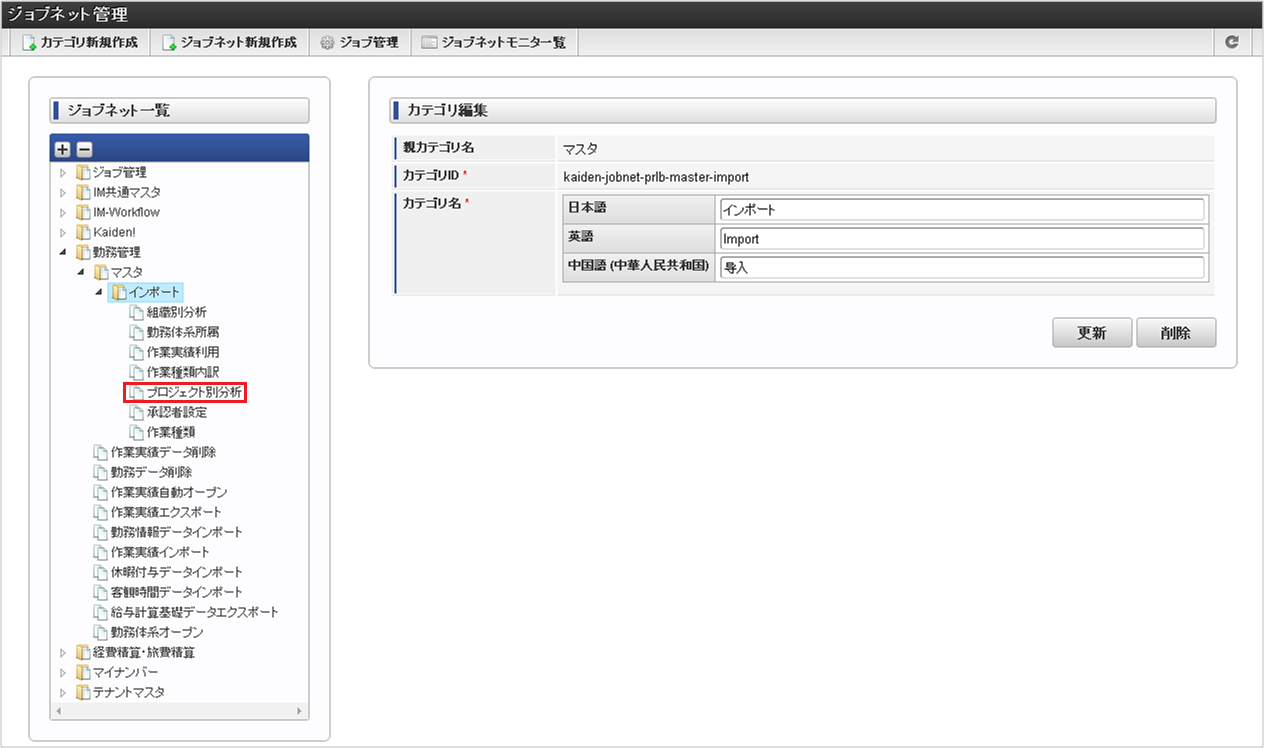 ジョブID ジョブ名(ジョブ選択時のツリー) kaiden-job-master-import-projectAnalysis 勤務管理 / マスタ / インポート / プロジェクト別分析 編集後、「更新」をクリックします。 確認ポップアップの「決定」をクリックします。 ジョブネットが設定されました。コラム