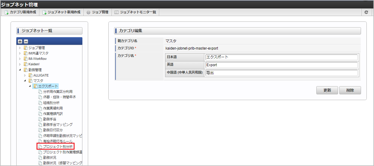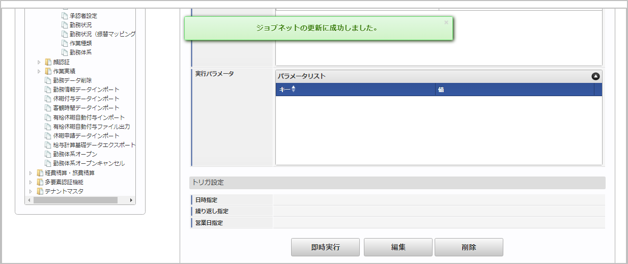 ジョブID ジョブ名(ジョブ選択時のツリー) kaiden-job-master-export-projectAnalysis 勤務管理 / マスタ / エクスポート / プロジェクト別分析 編集後、「更新」をクリックします。 確認ポップアップの「決定」をクリックします。 ジョブネットが設定されました。