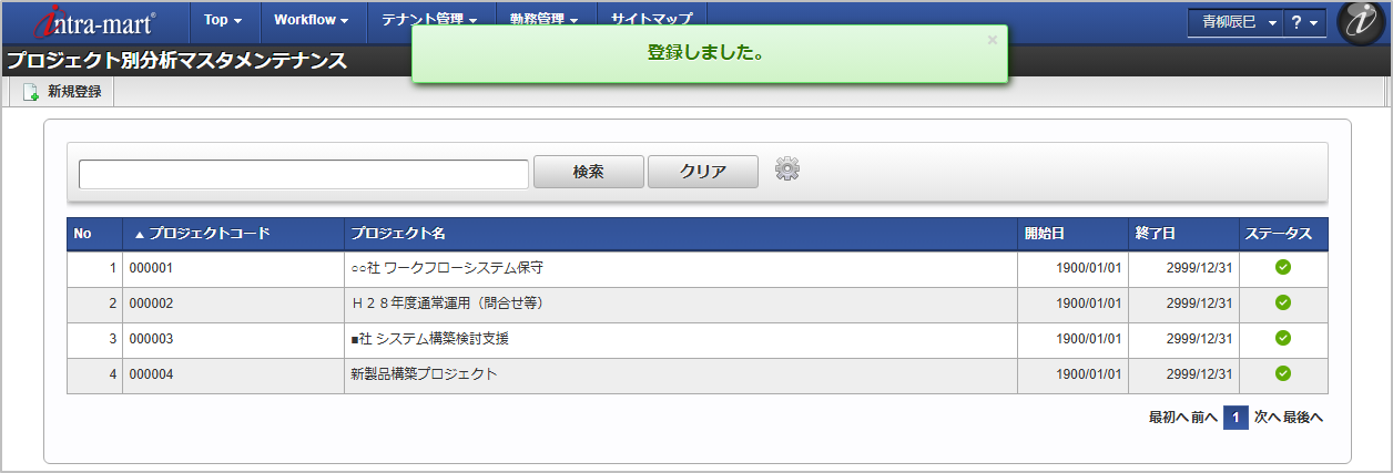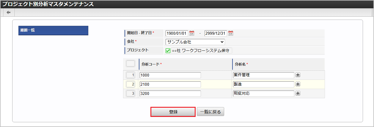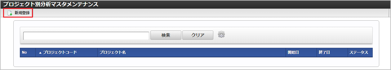 「サイトマップ」→「勤務管理」→「マスタメンテナンス」→「プロジェクト別分析」をクリックします。 一覧画面表示後、「新規登録」をクリックします。 登録/更新画面で必要な情報を入力し、「登録」をクリックします。