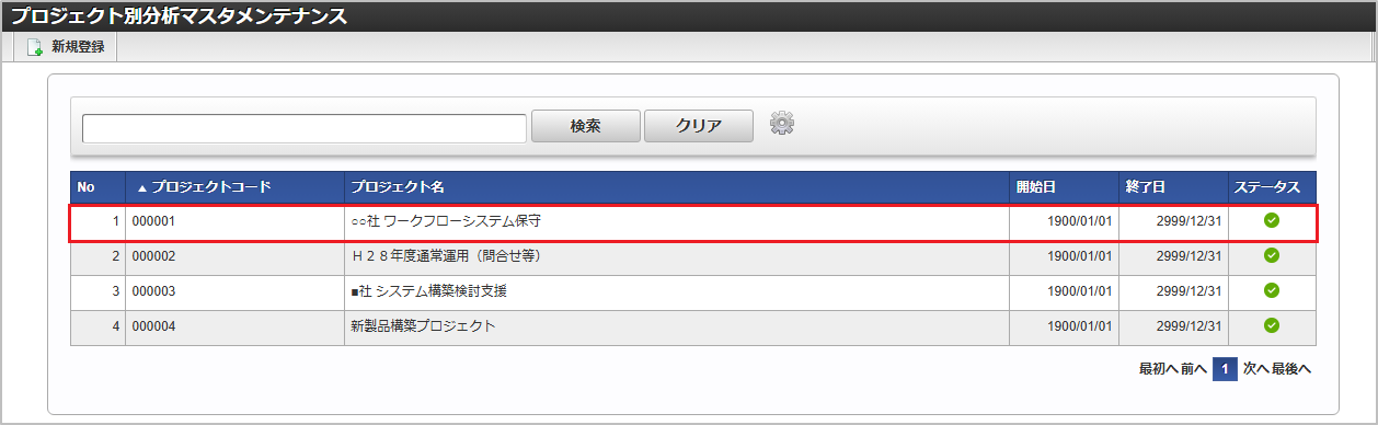 プロジェクトコード プロジェクト名 一覧画面の対象データが表示されている行をクリックします。コラム