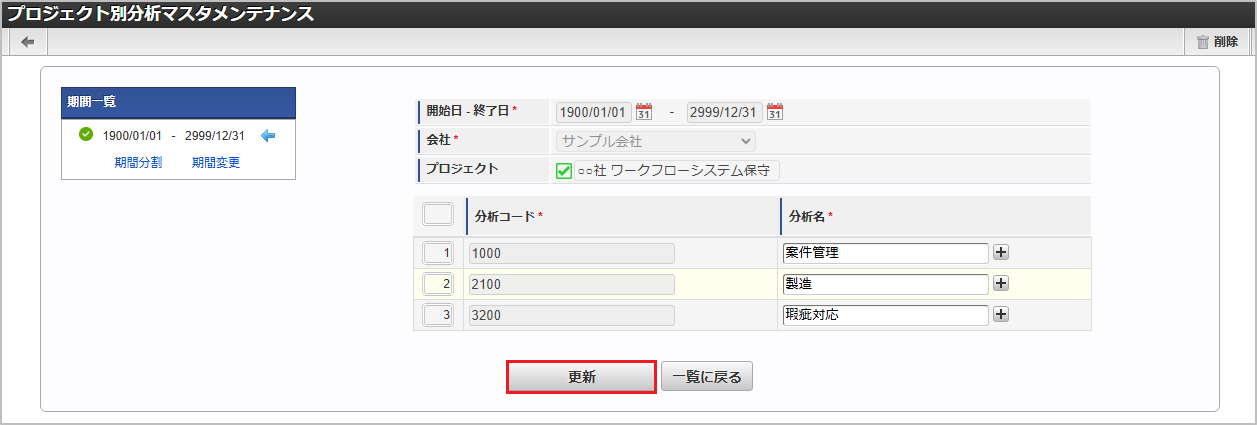 プロジェクト会社ごとに一意のプロジェクトを選択します。 分析コードプロジェクトごとに一意のコードを入力します。 分析名分析の名称を入力します。コラム