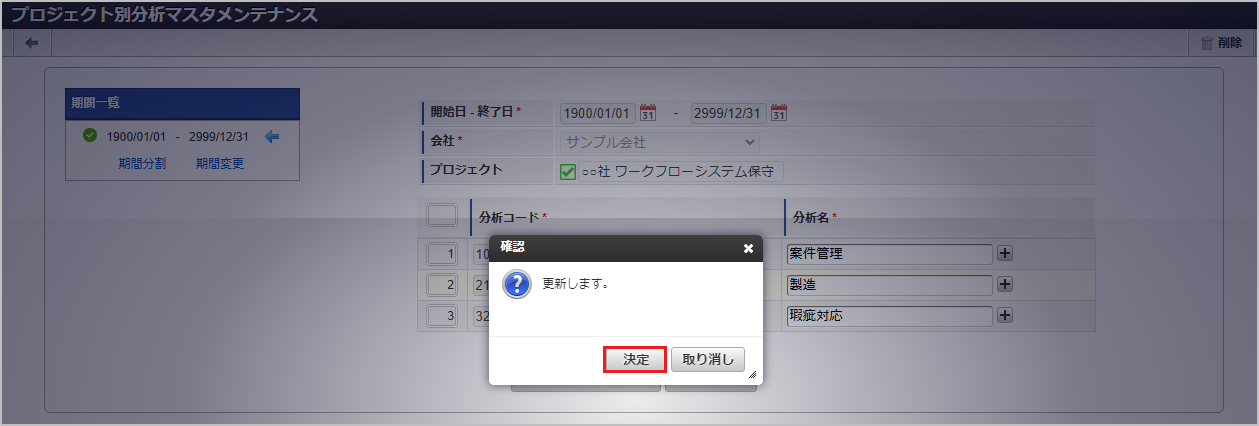 期間機能の操作方法は、 期間の操作 を参照してください。 確認ポップアップが表示されますので、「決定」をクリックします。 更新することができました。