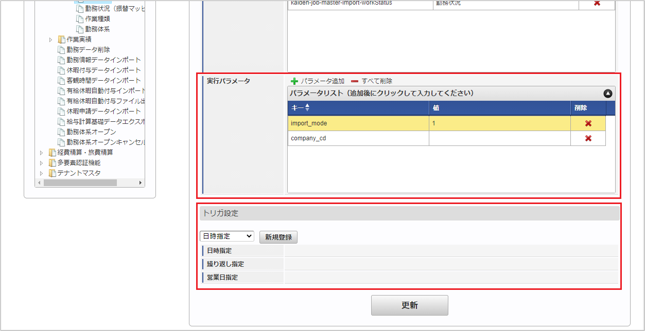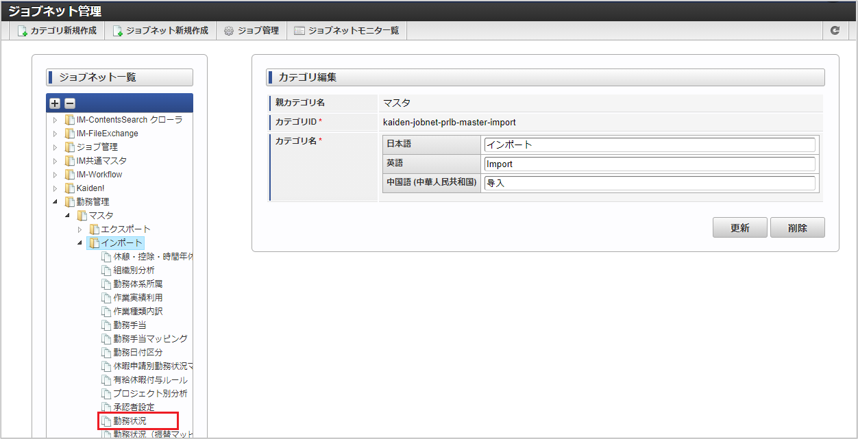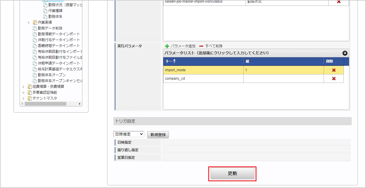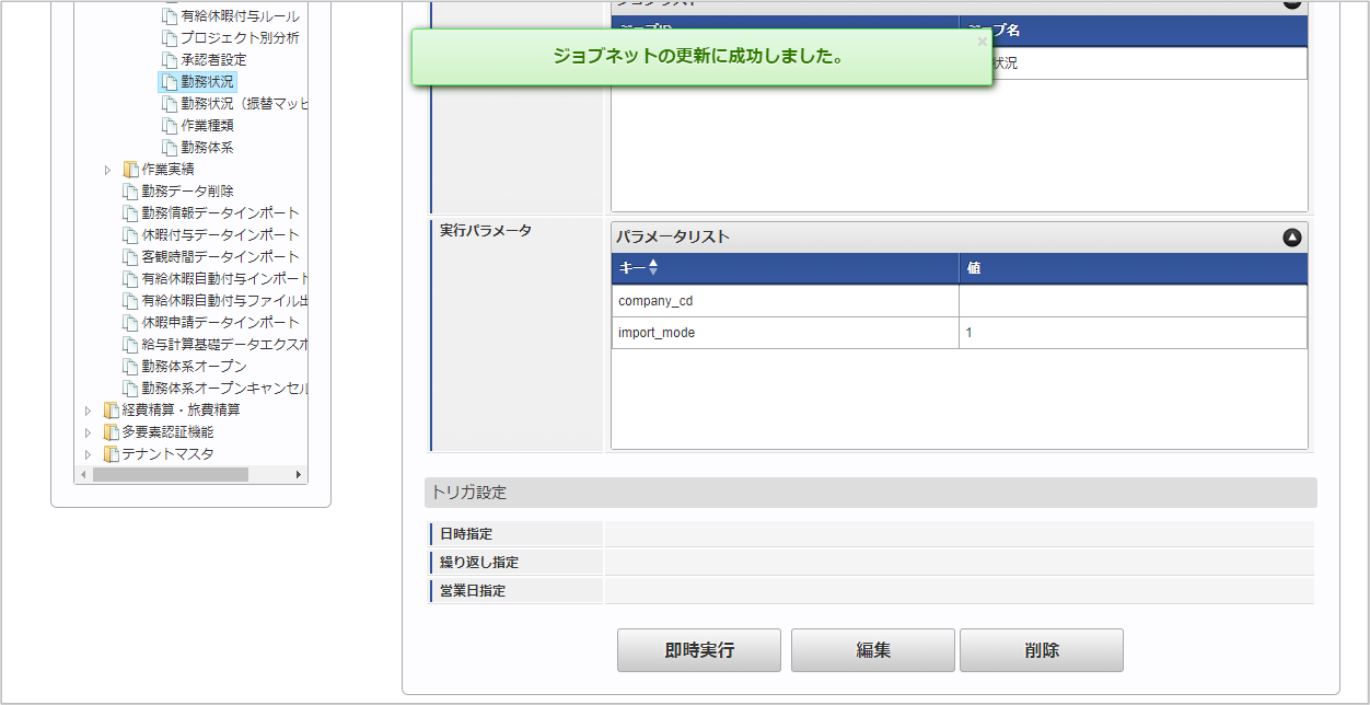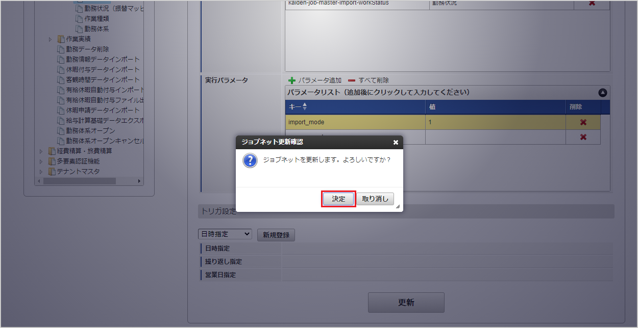 ジョブID ジョブ名(ジョブ選択時のツリー) kaiden-job-master-import-workStatus 勤務管理 / マスタ / インポート / 勤務状況 編集後、「更新」をクリックします。 確認ポップアップの「決定」をクリックします。 ジョブネットが設定されました。コラム