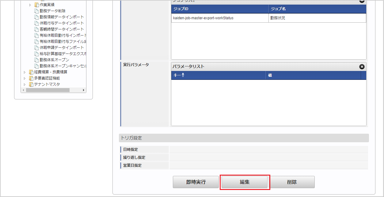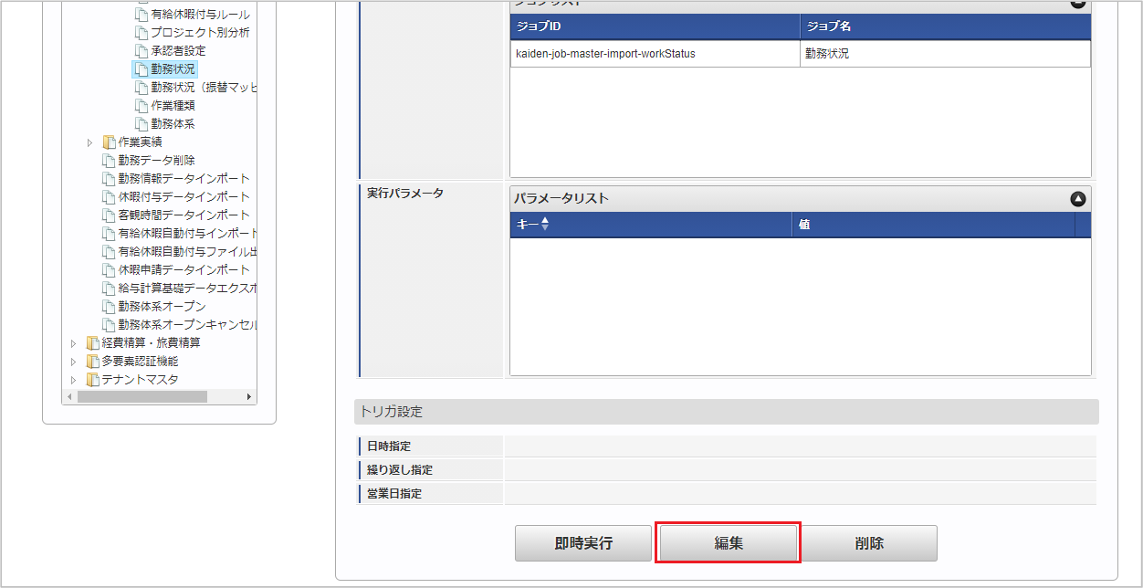 「サイトマップ」→「テナント管理」→「ジョブネット設定」をクリックします。 ジョブネット一覧(画面左部)の「勤務状況」をクリックします。 「編集」をクリックします。 必要に応じて「実行パラメータ」、「トリガ設定」を編集します。コラム
