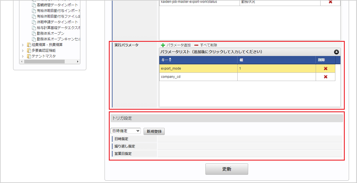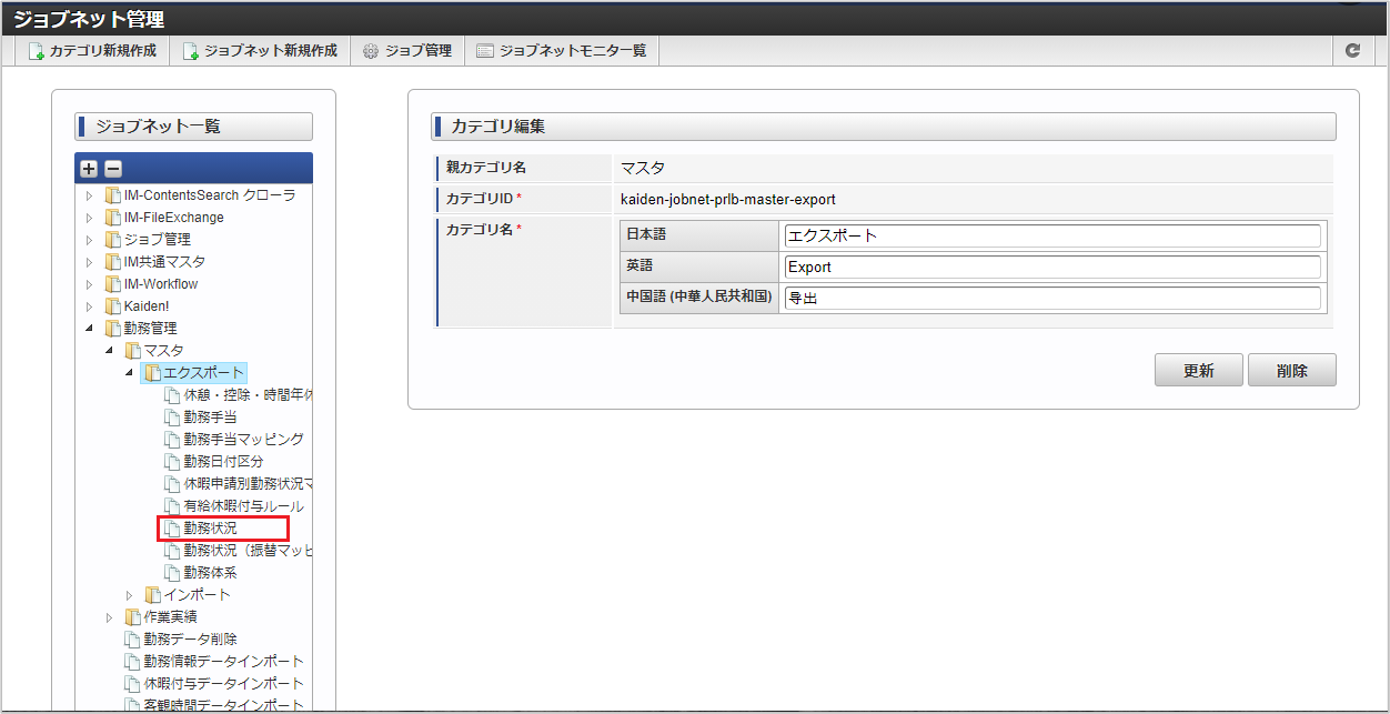 ジョブID ジョブ名(ジョブ選択時のツリー) kaiden-job-master-export-workStatus 勤務管理 / マスタ / エクスポート / 勤務状況 編集後、「更新」をクリックします。 確認ポップアップの「決定」をクリックします。 ジョブネットが設定されました。