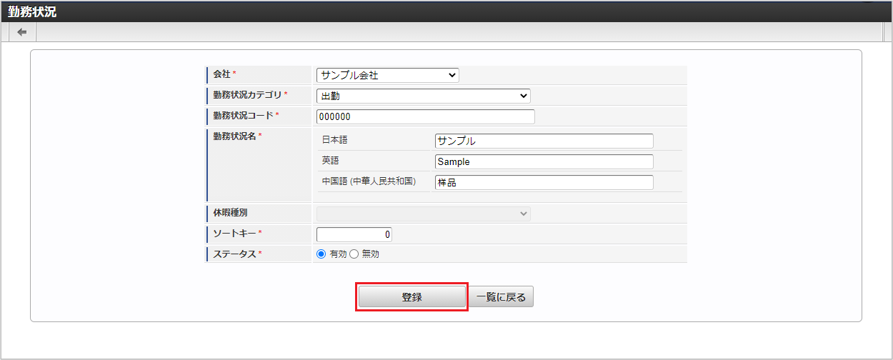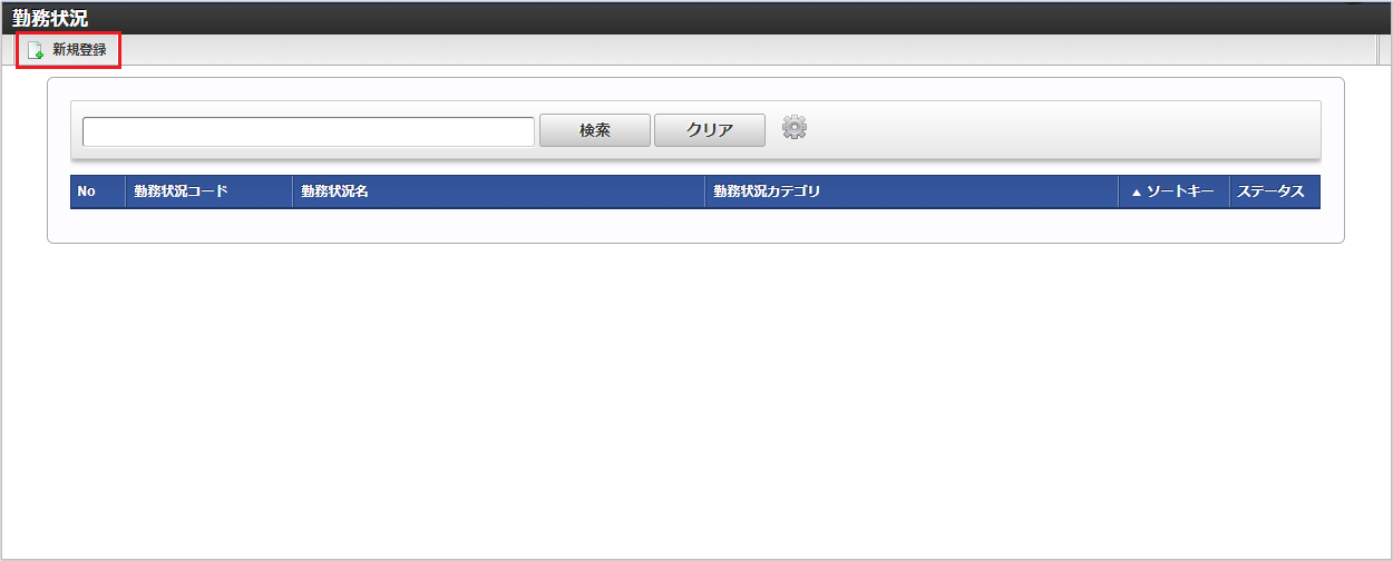 「サイトマップ」→「勤務管理」→「マスタメンテナンス」→「勤務状況」をクリックします。 一覧画面表示後、「新規登録」をクリックします。 登録/更新画面で必要な情報を入力し、「登録」をクリックします。
