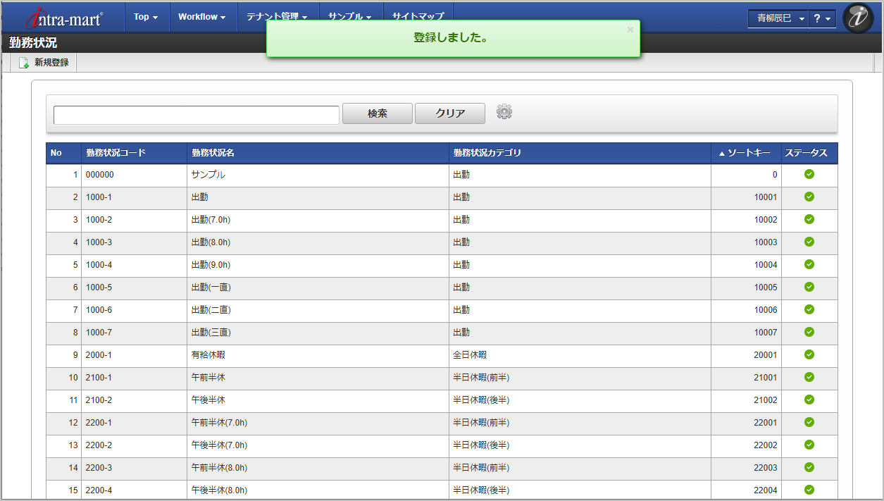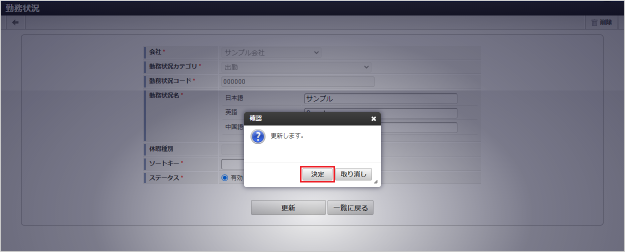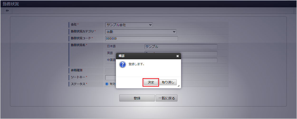 「休暇種別」、「休暇種別(午前)」、「休暇種別(午後)」は、休暇の残日数を休暇管理マスタで管理する時に選択します。項目マスタの項目区分が「休暇種別」の項目の残日数を管理できます。初期データでは、「有給休暇」が登録されています。 確認ポップアップが表示されますので、「決定」をクリックします。 新規登録することができました。