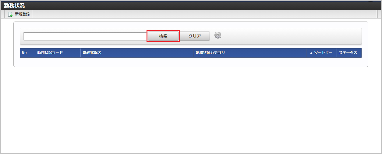 「サイトマップ」→「勤務管理」→「マスタメンテナンス」→「勤務状況」をクリックします。 一覧画面で「検索」をクリックします。コラム