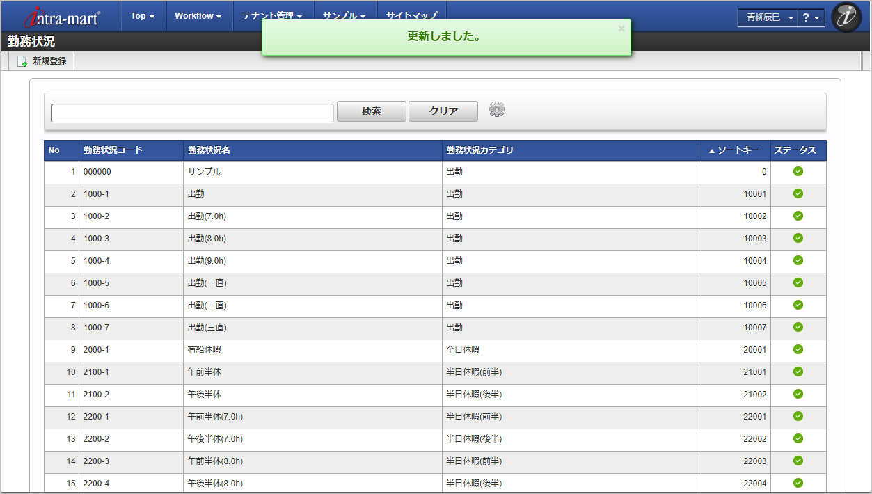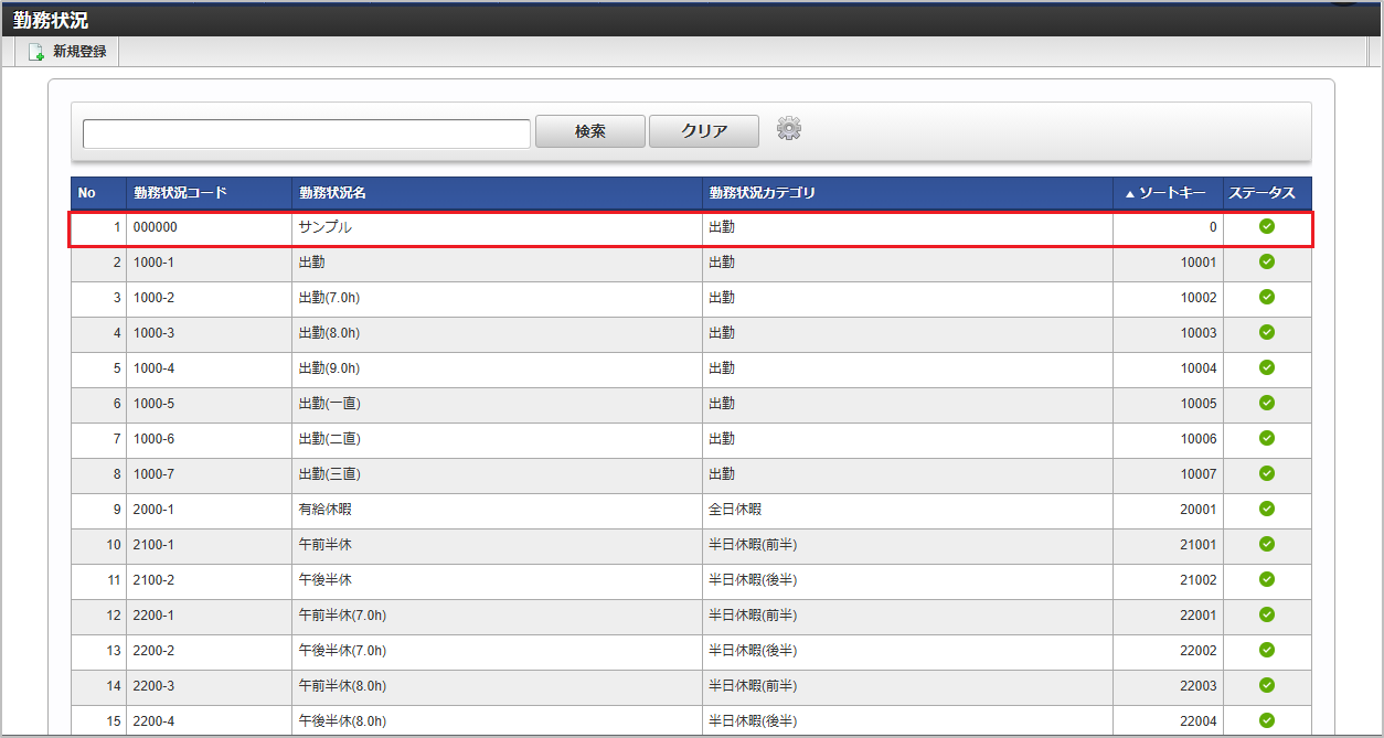 勤務状況コード 勤務状況名 勤務状況カテゴリ 一覧画面の対象データが表示されている行をクリックします。コラム
