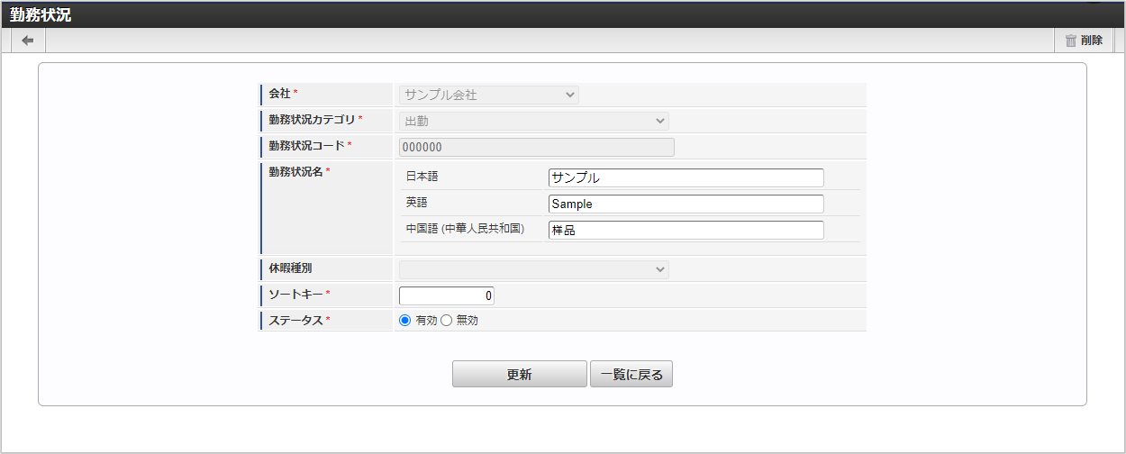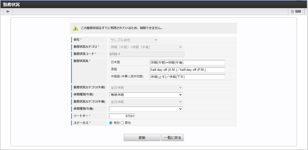 勤務状況カテゴリ勤務状況が属する勤務状況カテゴリを選択します。 勤務状況コード会社ごとに一意のコードを入力します。 勤務状況名勤務状況の名称を入力します。 休暇種別勤務状況カテゴリが全日休暇、半日休暇(午前)、半日休暇(午後)の時、選択可能です。 勤務状況カテゴリ(午前)勤務状況カテゴリが下記のいずれかの時、選択可能です。