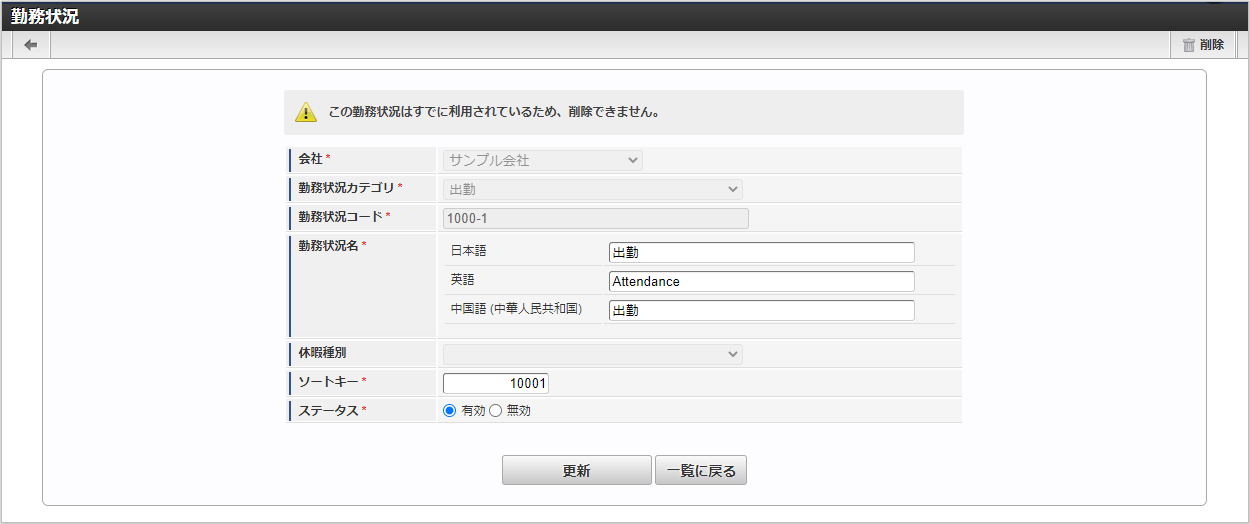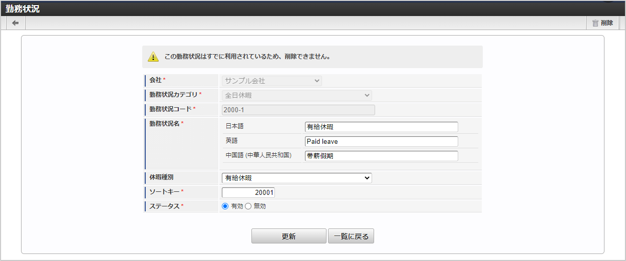 一度でも勤務表から利用した勤務状況は、休暇種別の変更、および削除はできません。この制限事項は、対象の勤務表がアーカイブされない限り解除されません。ただし勤務状況カテゴリが次の場合、休暇種別の変更が可能です。