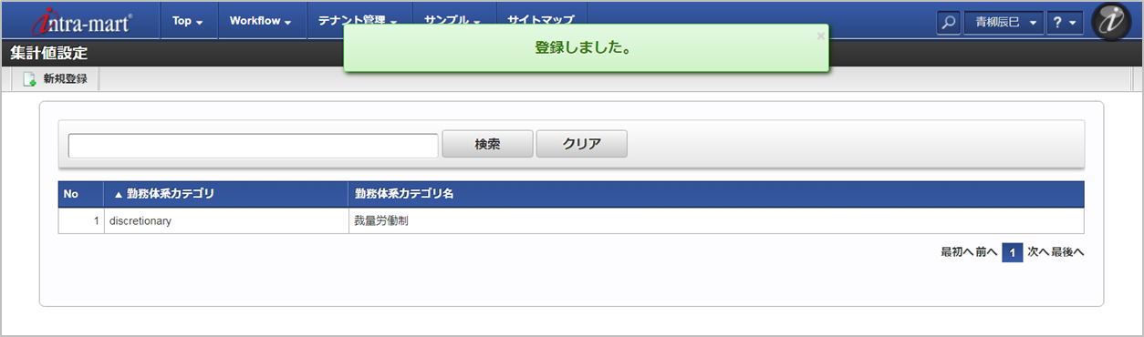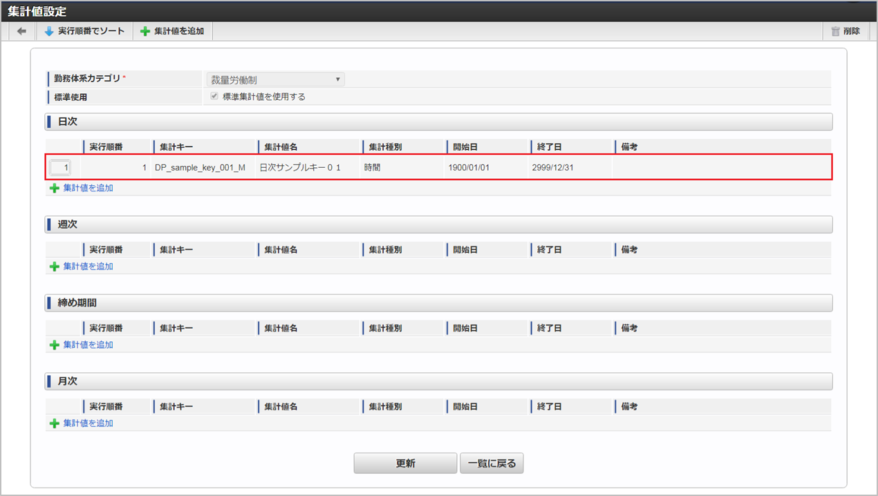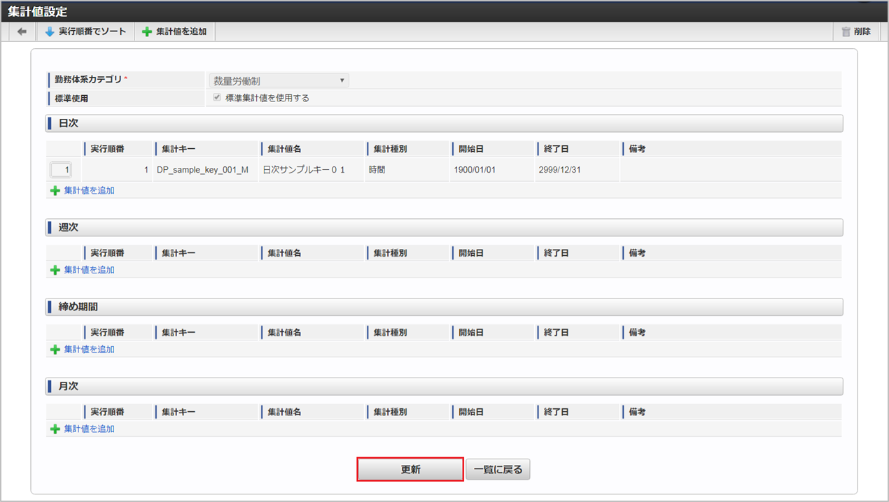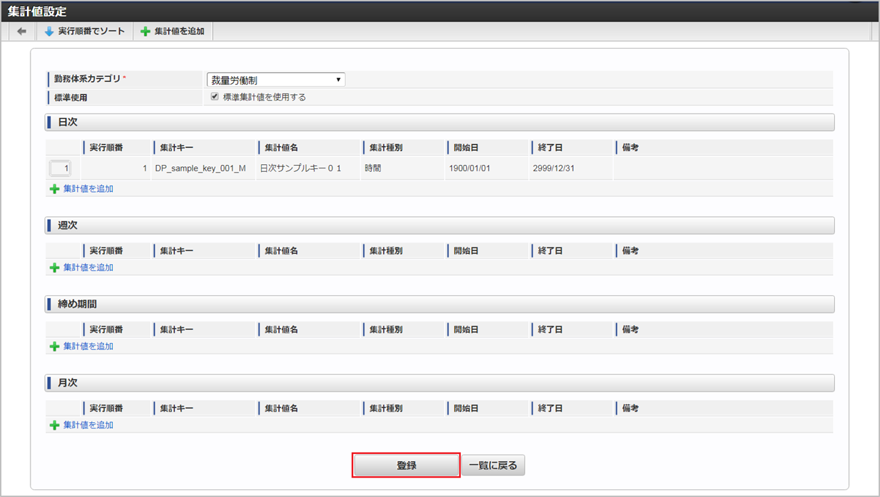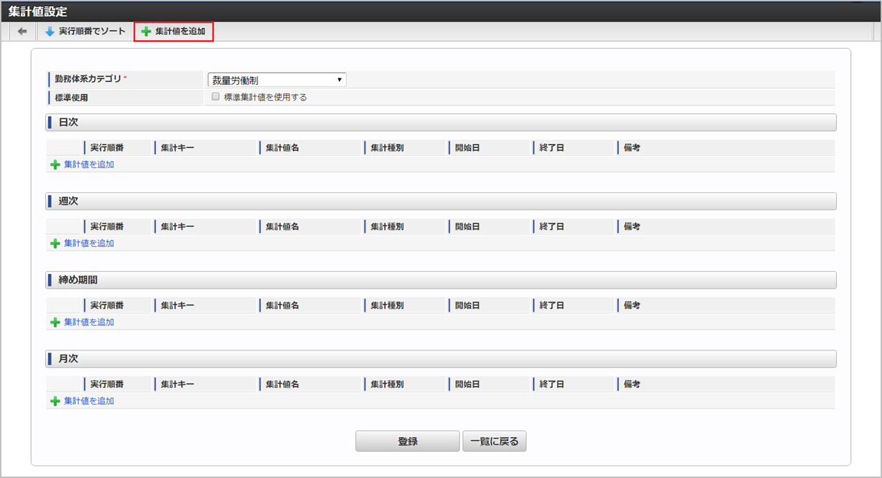 「サイトマップ」→「勤務管理」→「マスタメンテナンス」→「集計値設定」をクリックします。 一覧画面表示後、「新規登録」をクリックします。 登録/更新画面で必要な情報を入力し、「集計値を追加」をクリックします。