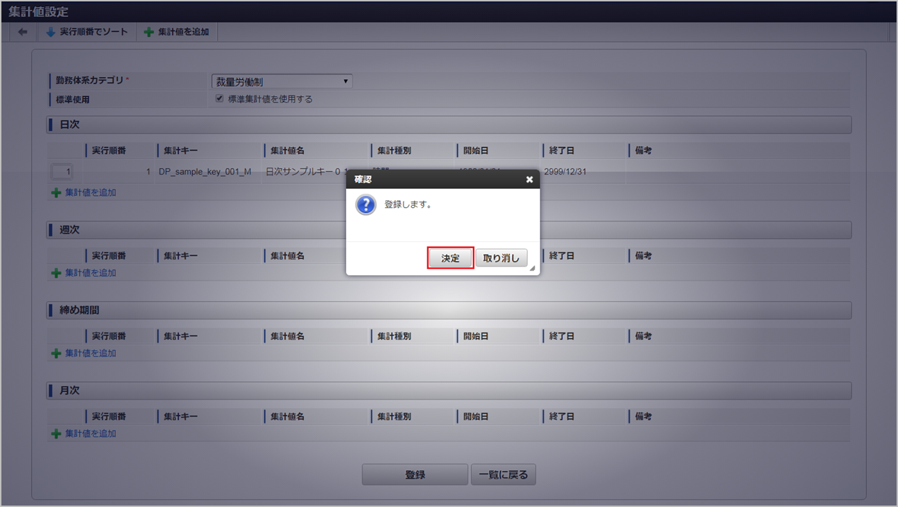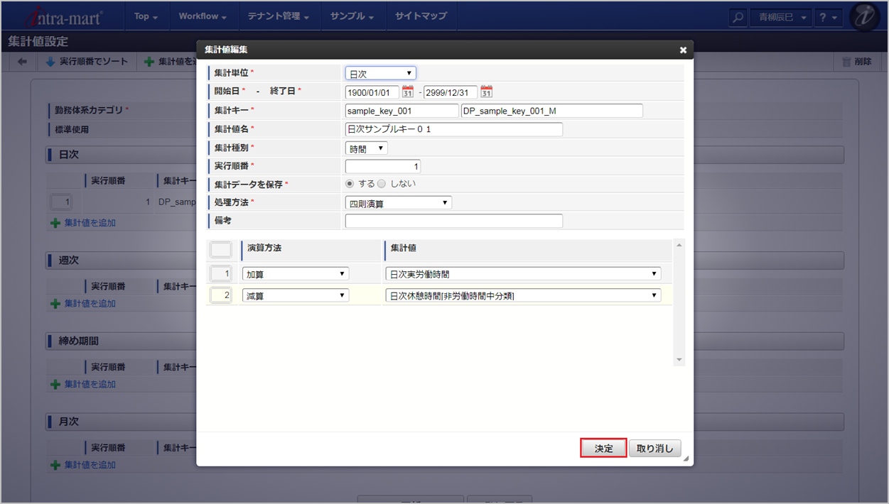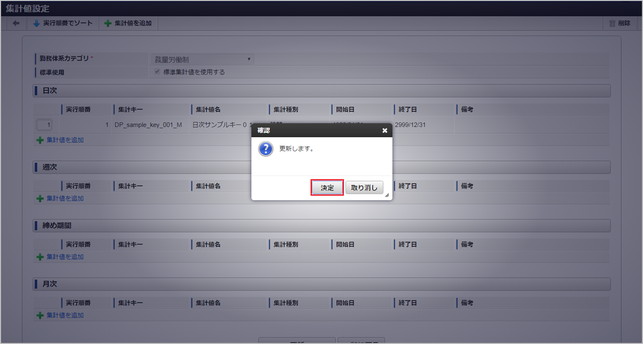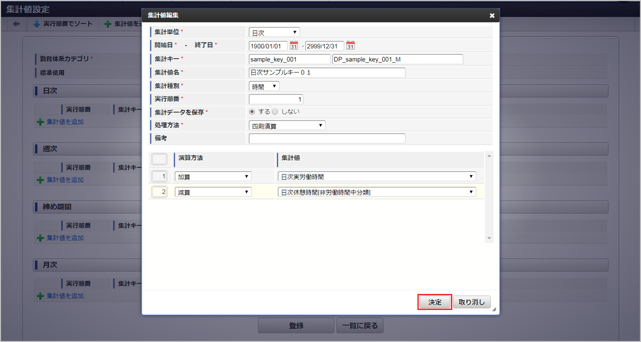 標準使用を選択しない場合、製品標準の集計値の集計が行われません。 集計値編集画面で必要な情報を入力し、「決定」をクリックします。