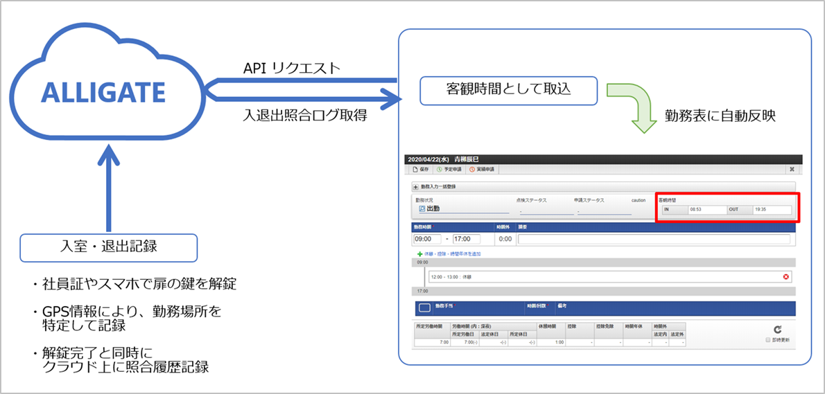 本項では、「ALLIGATE」の入退館システムと連携するイメージを紹介します。