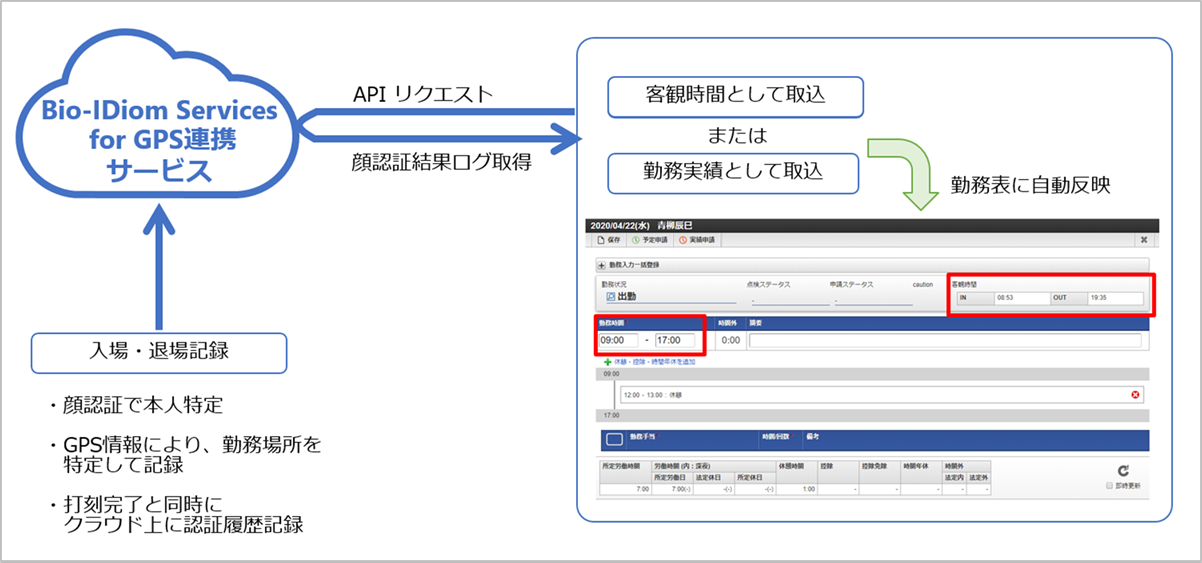 本項では、「Bio-IDiom Services for GPS連携」の顔認証サービスと連携するイメージを紹介します。