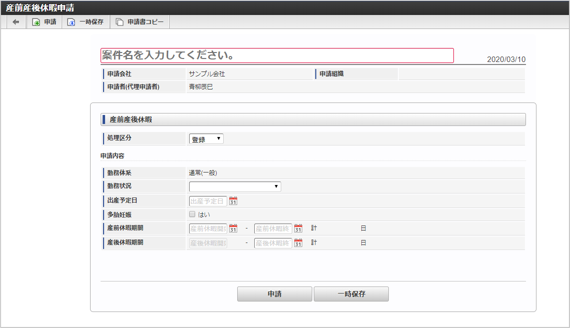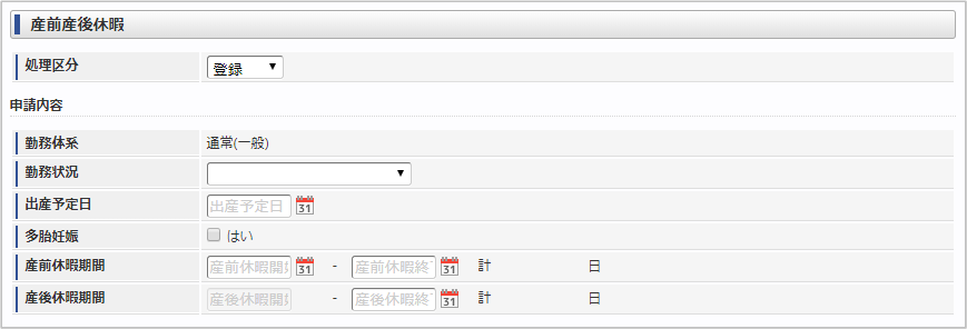 勤務体系申請基準日時点で所属している勤務体系を表示します。 勤務状況勤務状況を選択します。 出産予定日出産予定日を入力します。 多胎妊娠多胎妊娠の場合、チェックします。 産前休暇期間産前休暇期間を入力します。また休暇期間の日数を自動計算し表示します。 産後休暇期間産後休暇期間を入力します。産後休暇期間の開始日は出産予定日の翌日が設定され変更できません。また休暇期間の日数を自動計算し表示します。コラム