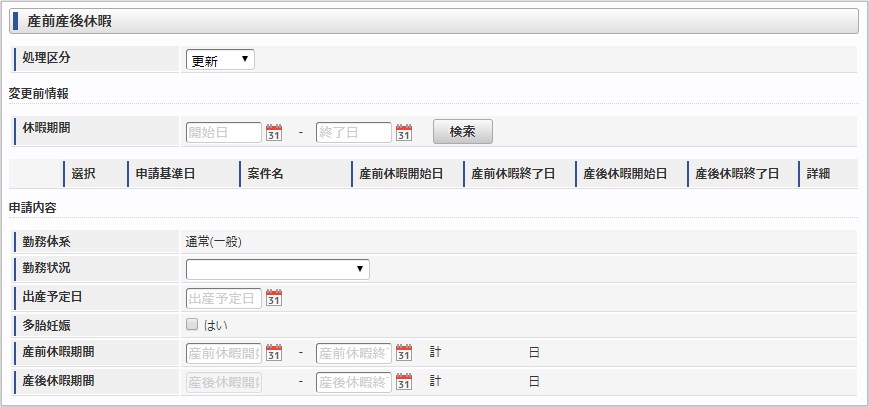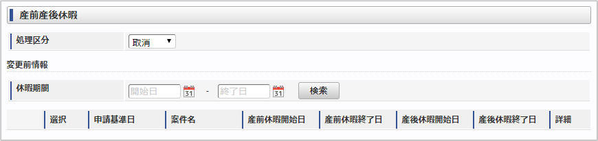 休暇期間変更前情報の休暇期間を入力します。 検索変更前情報となる産前産後休暇申請を検索します。 選択変更対象する産前産後休暇申請の場合、チェックします。 申請基準日産前産後休暇申請の申請基準日を表示します。 案件名産前産後休暇申請の案件名を表示します。 産前休暇開始日産前産後休暇申請の産前休暇開始日を表示します。 産前休暇終了日産前産後休暇申請の産前休暇開始日を表示します。 産後休暇開始日産前産後休暇申請の産前休暇開始日を表示します。 産後休暇終了日産前産後休暇申請の産前休暇開始日を表示します。 詳細産前産後休暇申請を別ウィンドウで表示します。