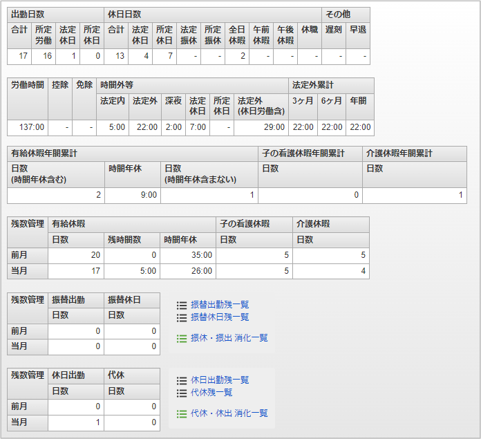 合計休日および有給休暇を取得した日数の合計です。 法定休日その月のカレンダー上での法定休日の日数です。 所定休日その月のカレンダー上での所定休日の日数です。 法定振休法定休日の出勤を振り替えた、振替休日の日数です。 所定振休所定休日の出勤を振り替えた、振替休日の日数です。 全日休暇有給休暇を取得した日数です。 午前休暇午前に半日の有給休暇を取得した日数です。 午後休暇午後に半日の有給休暇を取得した日数です。 休職休職日数です。その他