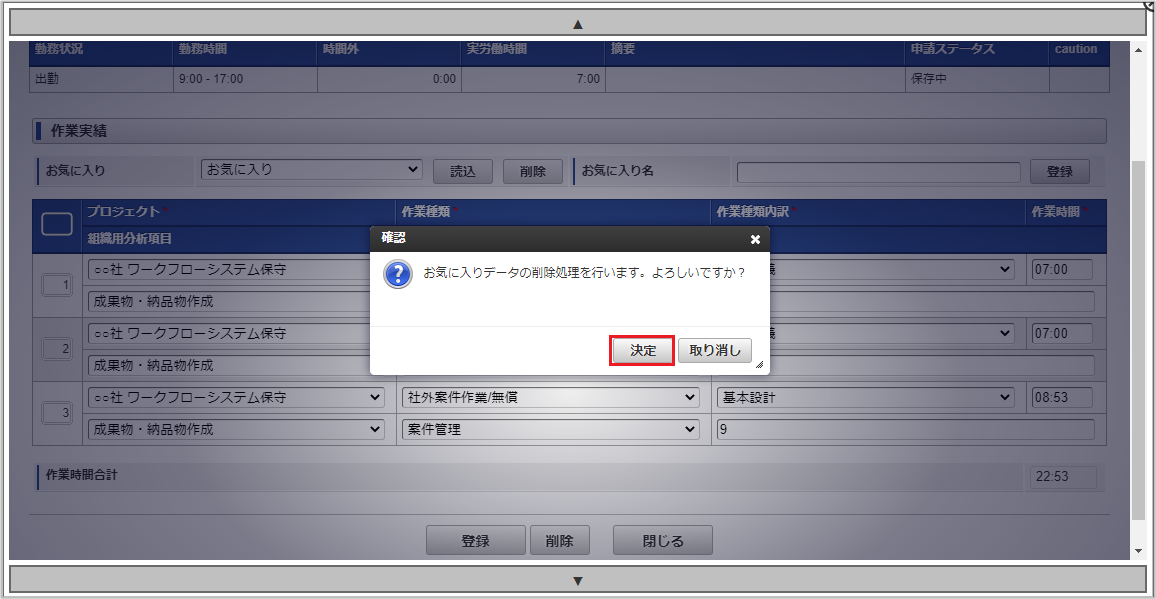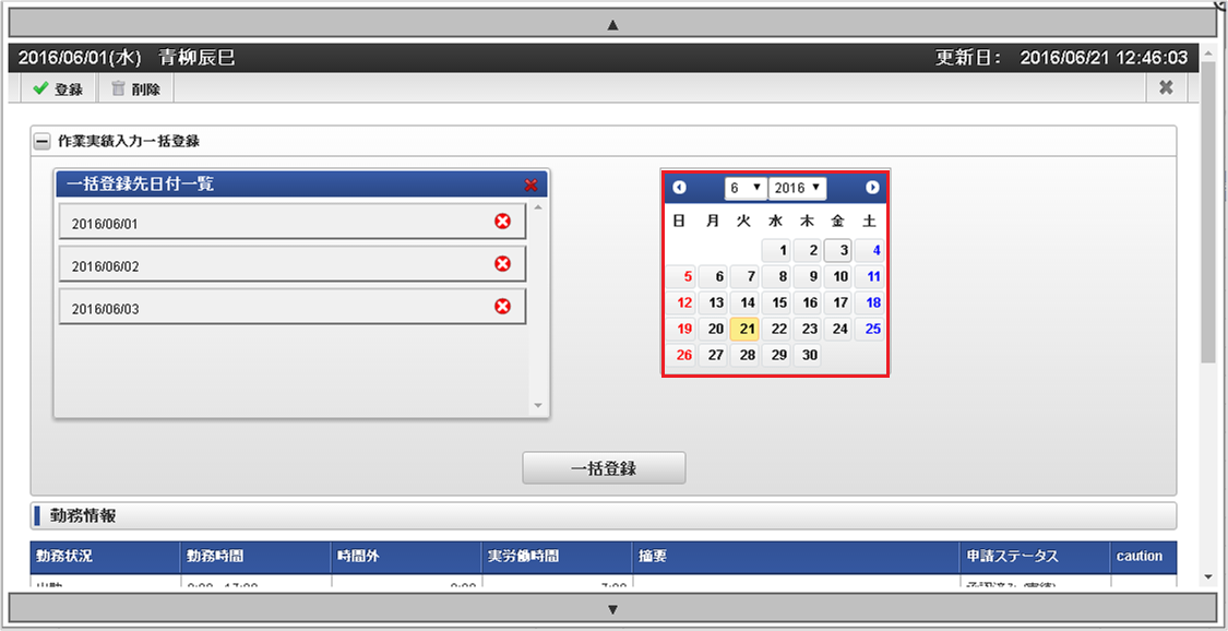 勤務表からの作業実績の入力は、勤務体系に所属している従業員のみ実施できます。勤務表の入力の詳細は、勤務表の操作を参照してください。注意