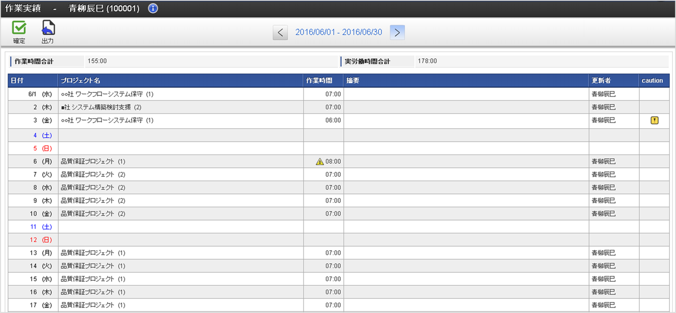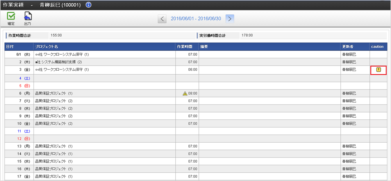 日々の作業内容に対する警告や会社規定違反がある場合、「caution (注意・警告)」アイコンが表示されます。日々の作業内容に対する「caution (注意・警告)」アイコンは一覧のcaution列に表示されます。作業実績入力画面にはその日に対する「caution (注意・警告)」アイコンが表示されます。