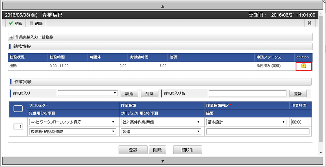 日々の作業内容に対する「caution (注意・警告)」アイコン (caution列) 日々の作業内容に対する「caution (注意・警告)」アイコン(作業実績入力画面) 作業実績入力画面の「caution (注意・警告)」アイコンをクリックすると詳細を確認できます。