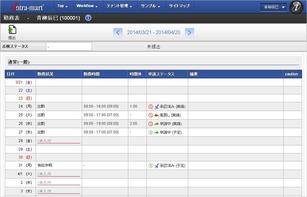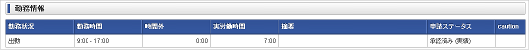 「サイトマップ」→「勤務管理」→「勤務表」をクリックします。 勤務表一覧の各行をクリックすることで、その日付の勤務実績/予定とともに、作業実績を入力できます。コラム