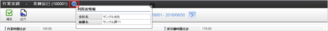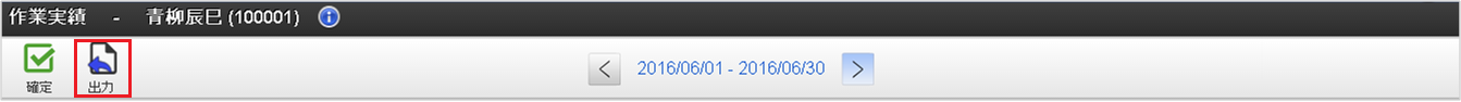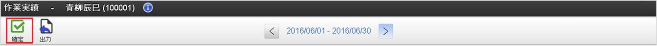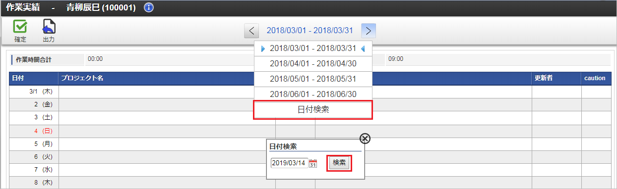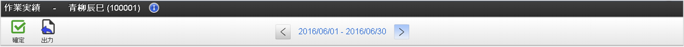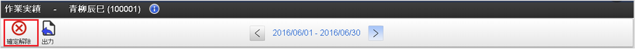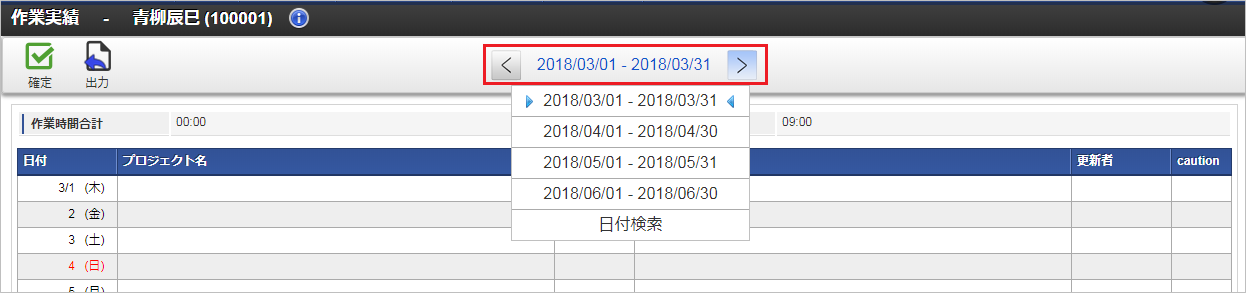 利用者情報利用者の氏名や従業員番号を表示しています。「情報」アイコンをクリックすると、所属組織などの利用者情報が参照できます。 確定・確定解除アイコン「確定」アイコンをクリックすると、作業実績の確定ができます。「確定解除」アイコンをクリックすると、作業実績の確定を解除できます。 出力アイコン「出力」アイコンをクリックすると、対象年月の作業実績をPDFで出力できます。 締め期間情報表示している作業実績一覧の対象締め期間を表示しています。「右」、または「左」アイコンをクリックすると、作業実績一覧の対象締め期間を前後に変更できます。また、締め期間の一覧から締め期間をクリックすると、対象の締め期間に変更できます。「日付検索」をクリックすると、日付検索ダイアログが起動します。日付検索ダイアログに検索対象日付を入力し、検索ボタンをクリックすると、指定した日付を含む締め期間の作業実績一覧を表示します。