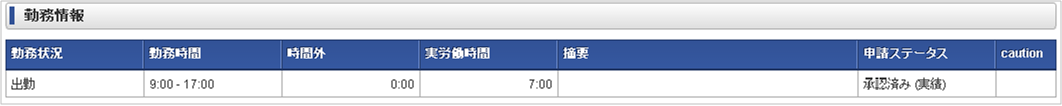 日付カレンダーの日付を表示します。休日などに設定されている日付は、異なる文字色で表示します。 プロジェクト名作業実績入力画面で選択したプロジェクト名を表示します。また、プロジェクト名の末尾に作業実績入力画面で入力した行数を表示します。 作業時間作業実績入力画面で入力した作業時間を表示します。また、対象日に勤務体系に所属していて、勤務表の入力がないが作業実績が入力されている場合に、警告アイコンが表示されます。 摘要作業実績入力画面で入力した摘要を表示します。 更新者作業実績を更新したユーザの名称を表示します。 caution(注意・警告)各日毎に発生した注意・警告など情報の有無を表示します。コラム