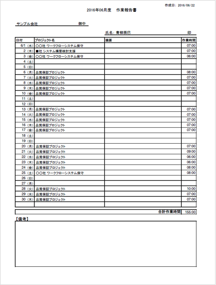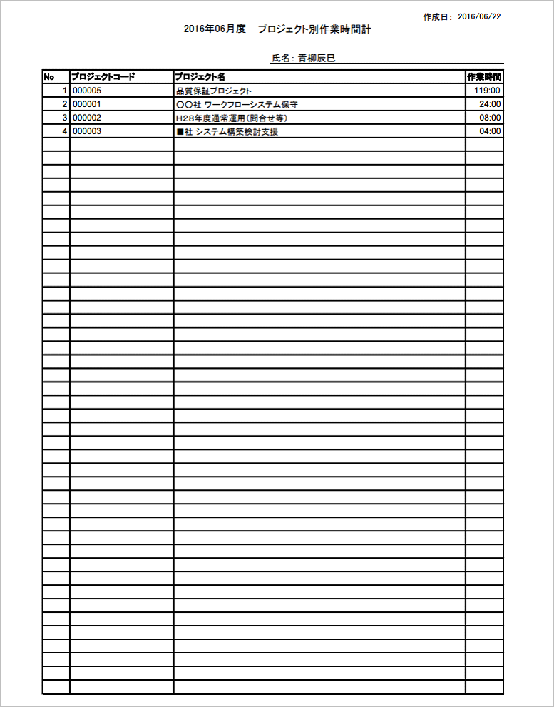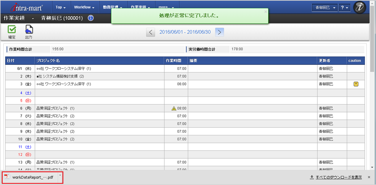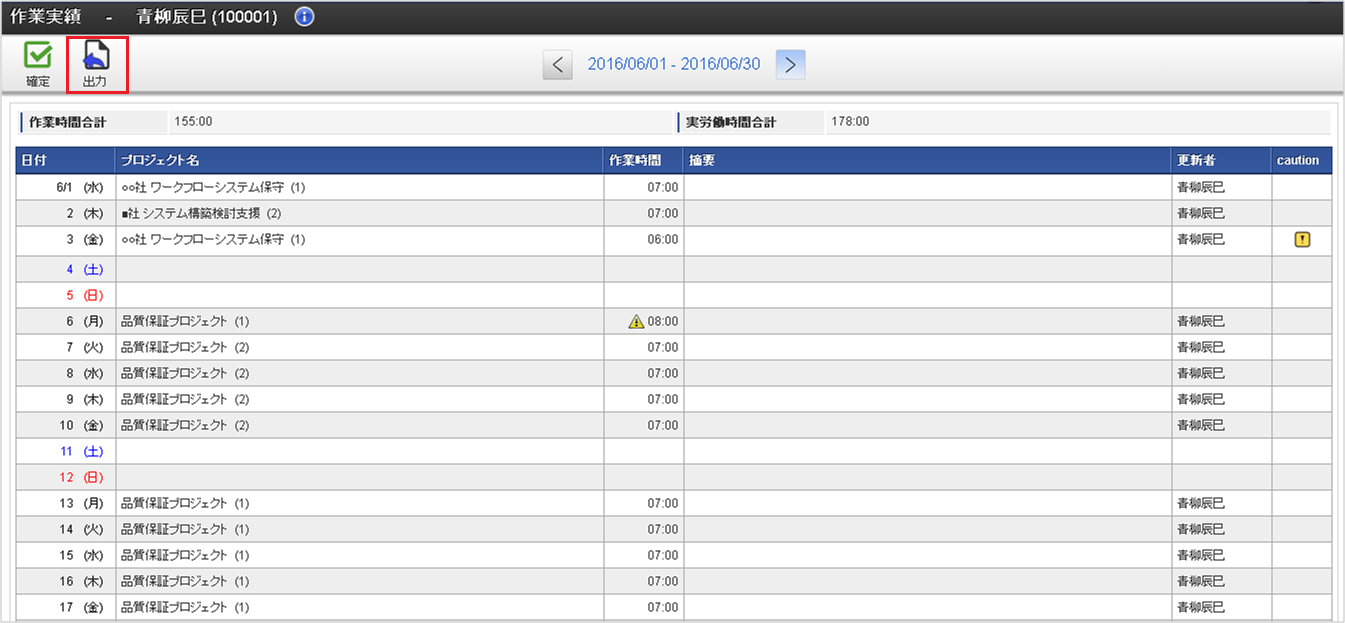 作業実績をPDF形式で帳票出力することが可能です。 対象月度の作業実績と、プロジェクト別の作業時間を出力します。 「出力」をクリックします。 「出力」をクリック後、しばらく経つと作業実績がダウンロードされます。 コラム 作業実績の出力は、その月のオープン後であれば、確定状態や組織締め状態に関わらず実施できます。 対象月度の作業実績を出力した帳票です。 プロジェクト別の作業時間を出力した帳票です。
