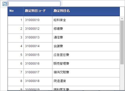 検索設定では、検索部品やセレクトボックスで使用する項目の設定を行います。設定<?xml version="1.0" encoding="UTF-8"?> <genericMasterSettings xmlns="http://kaiden.slcs.co.jp/xmlschema/genericMasterSettings"> <!-- 略 --> <search type="SELECT"> <items> <item name="accountCd" type="CODE"/> <item name="accountName" type="NAME" width="250px"/> </items> </search> <!-- 略 --> </genericMasterSettings>解説