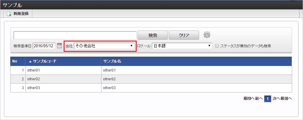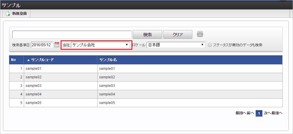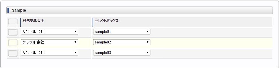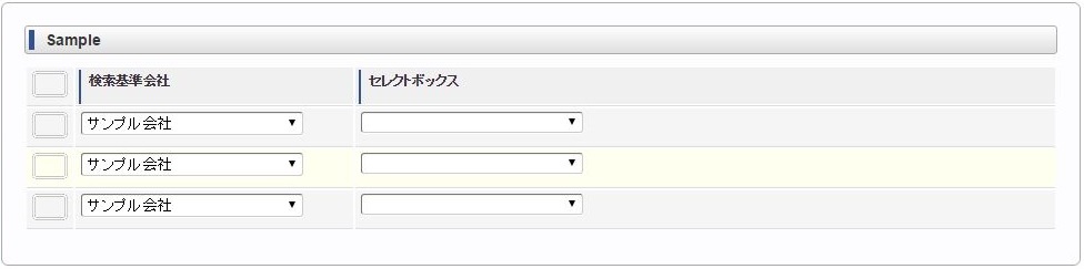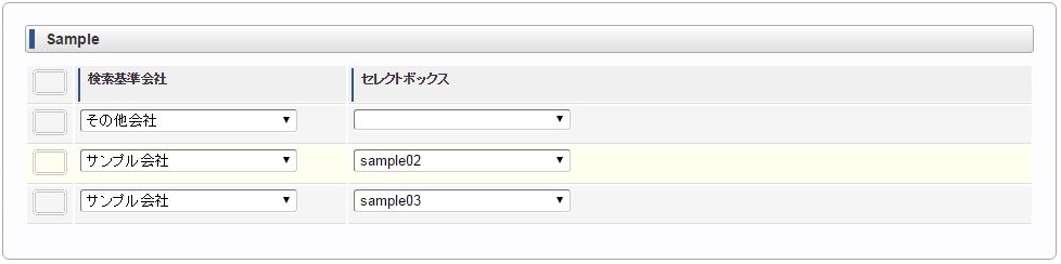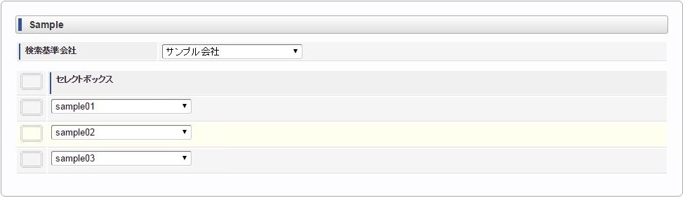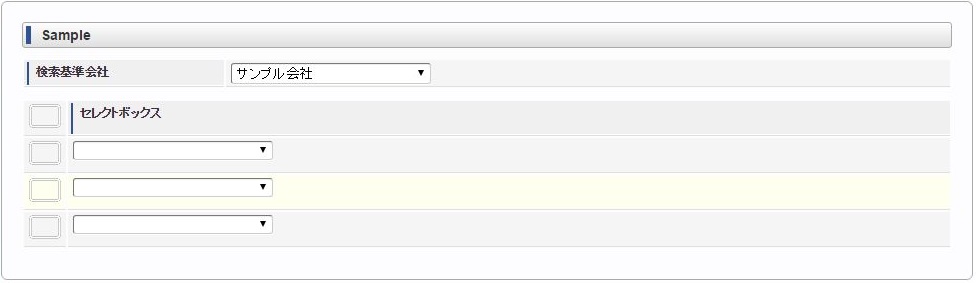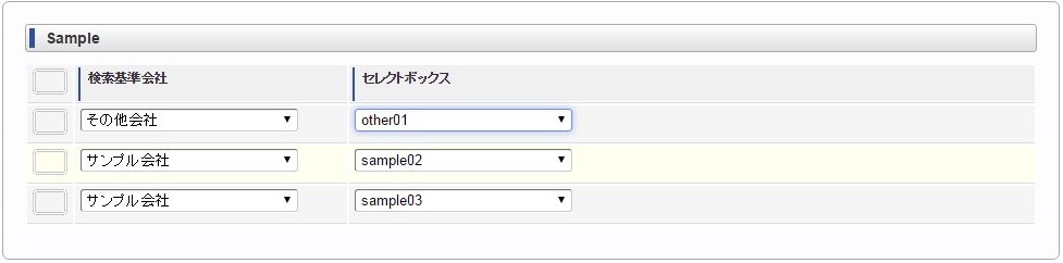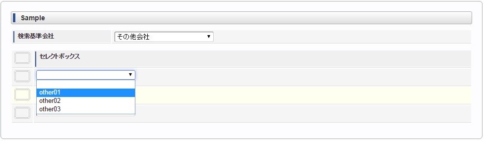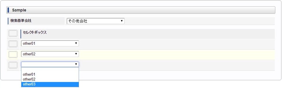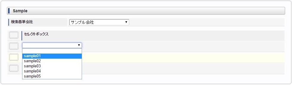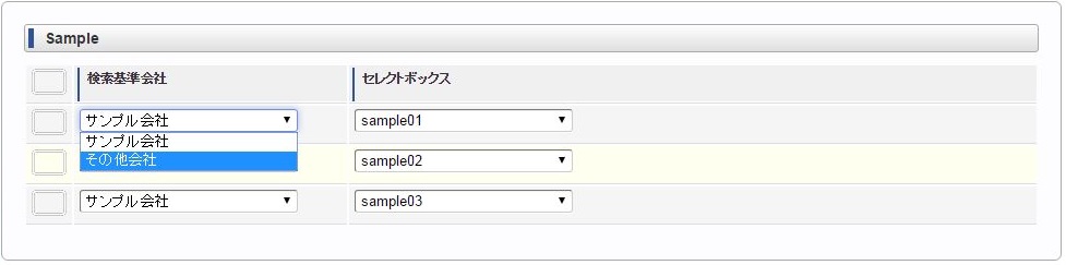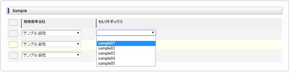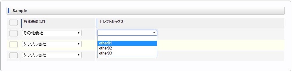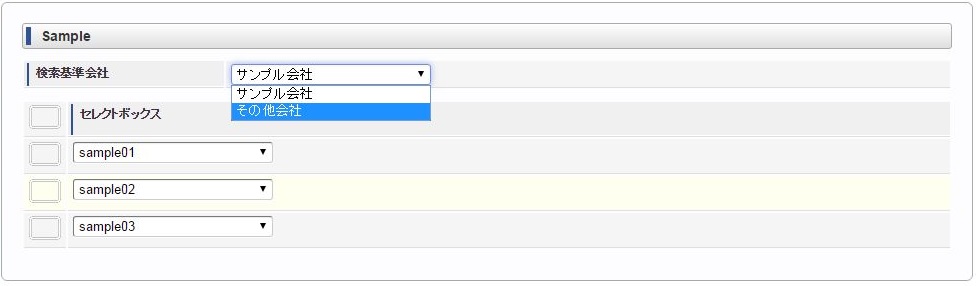 ヘッダー項目(検索基準会社)を選択します。 明細のセレクトボックスを選択します。同様に他のセレクトボックスを選択します。 ヘッダー項目(検索基準会社)を変更します。変更に合わせて明細のセレクトボックスすべてがリフレッシュされ、未選択状態に変更されます。 再度、明細のセレクトボックスを選択すると、ヘッダー項目(検索基準会社)に合わせたリストデータが表示されます。例)同じ明細項目の値変更に合わせて、明細項目をリフレッシュ同じ明細項目の値変更に合わせて明細のセレクトボックス(リストデータ)をリフレッシュする場合は、各リストデータ毎にリフレッシュする必要があります。コラム