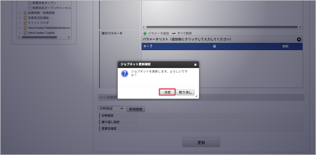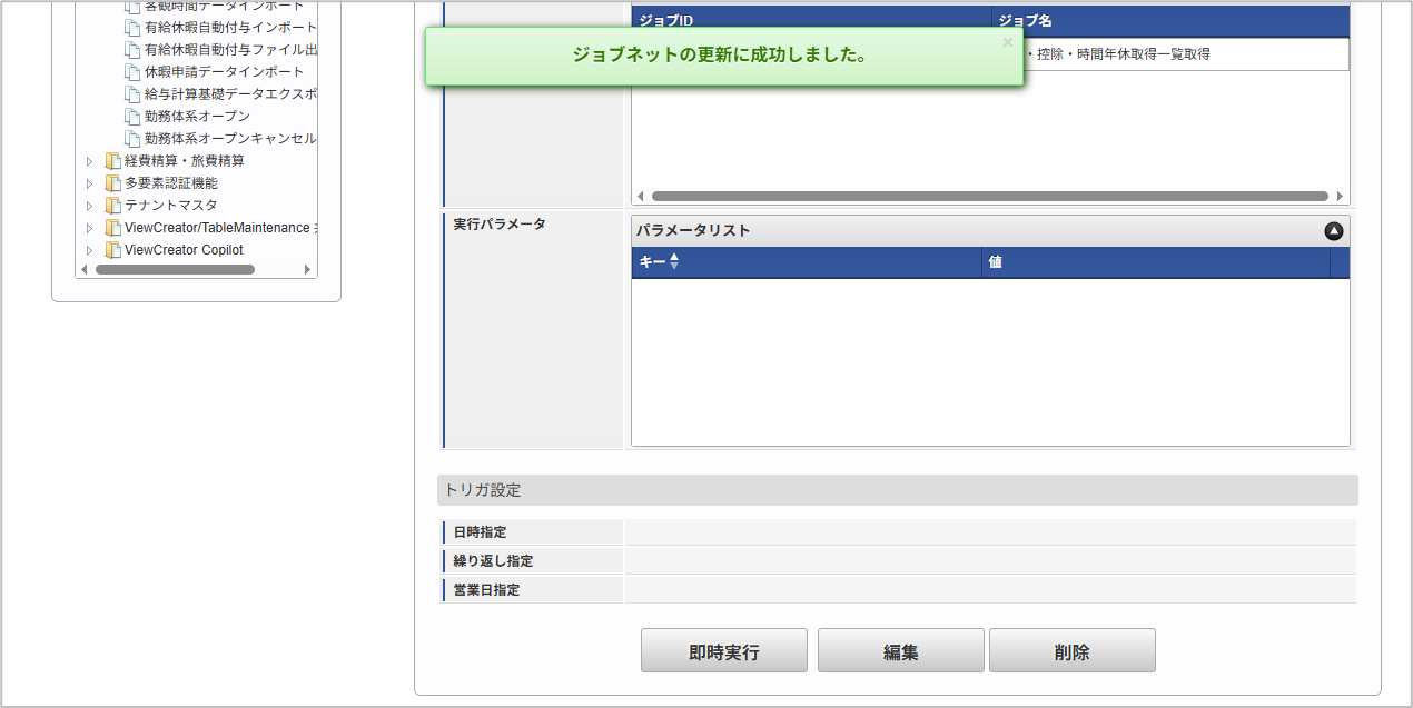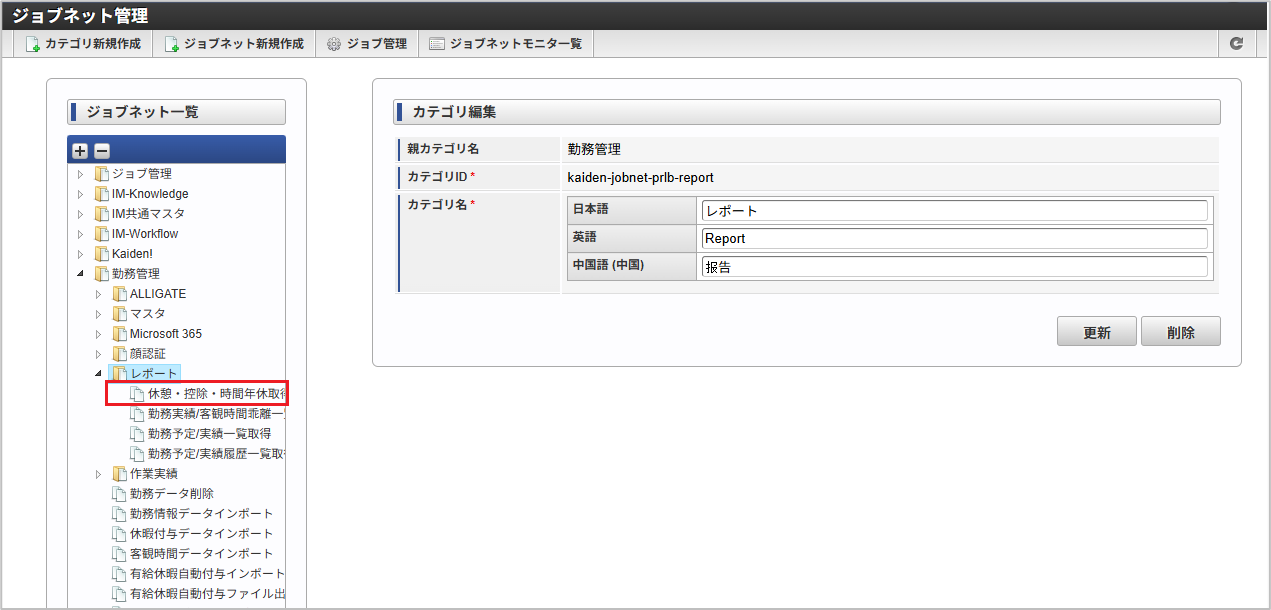 ジョブID ジョブ名(ジョブ選択時のツリー) kaiden-job-prlb-report-deduction 勤務管理 / レポート / 休憩・控除・時間年休取得一覧取得 編集後、「更新」をクリックします。 確認ポップアップの「決定」をクリックします。 ジョブネットが設定されました。