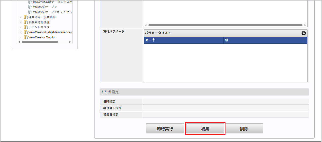 「サイトマップ」→「テナント管理」→「ジョブネット設定」をクリックします。 ジョブネット一覧(画面左部)の「休憩・控除・時間年休取得一覧取得」をクリックします。 「編集」をクリックします。 必要に応じて「トリガ設定」を編集します。コラム