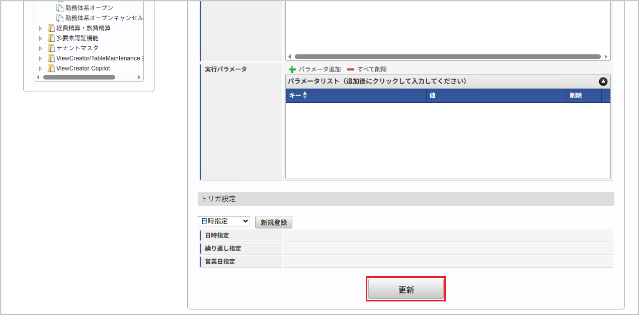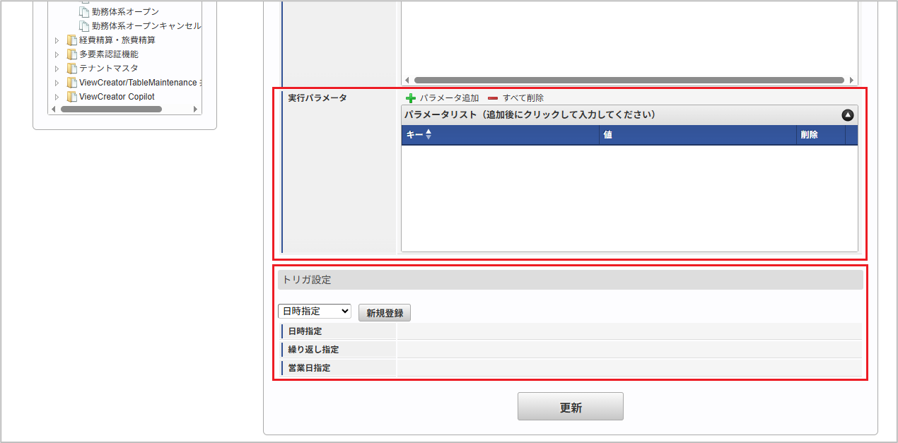 設定が必要な実行パラメータの詳細は、実行パラメータを参照してください。トリガ設定の設定方法は『テナント管理者操作ガイド』を参照してください。コラム