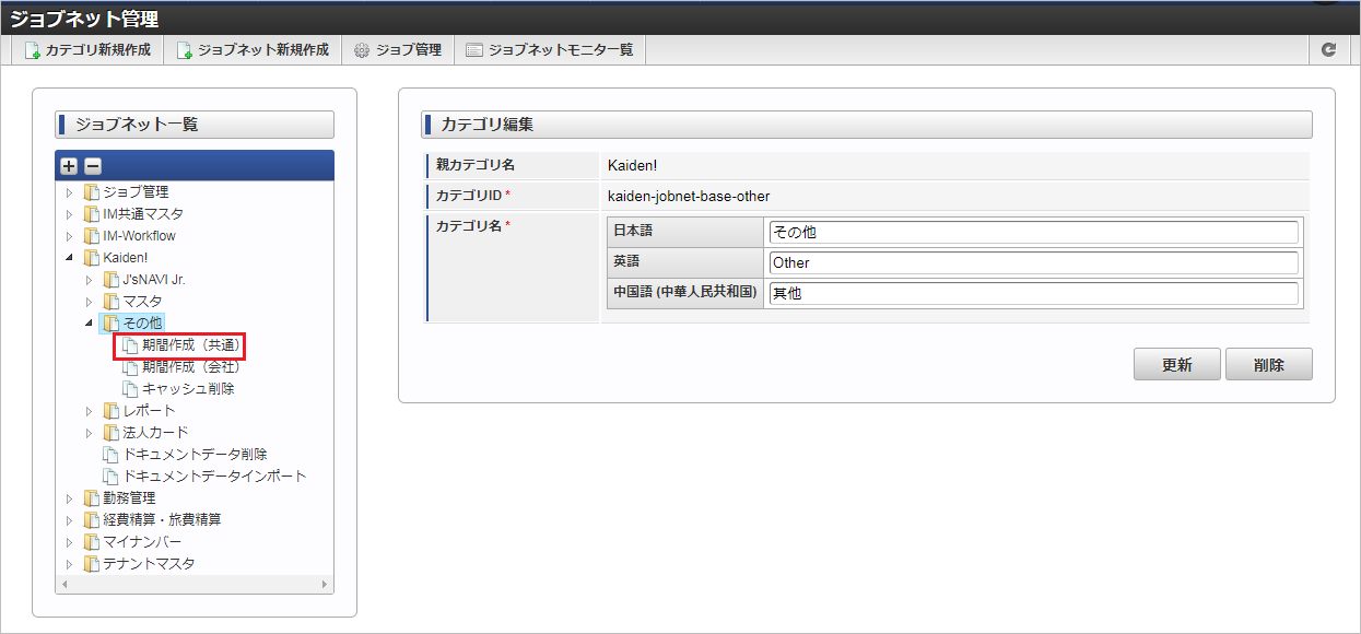 ジョブID ジョブ名(ジョブ選択時のツリー) kaiden-job-other-create-common-term Kaiden! / その他 / 期間作成(共通) 編集後、「更新」をクリックします。 確認ポップアップの「決定」をクリックします。 ジョブネットが設定されました。コラム