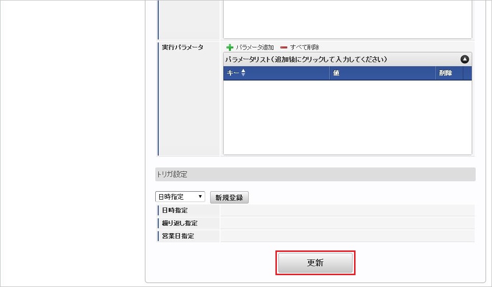 設定が必要な実行パラメータの詳細は、実行パラメータを参照してください。トリガ設定の設定方法は『テナント管理者操作ガイド』を参照してください。コラム