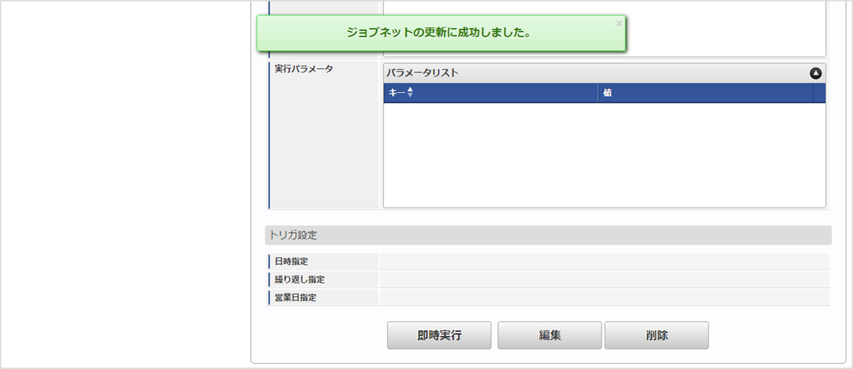 複数の「実行パラメータ」、「トリガ設定」を行う場合はジョブネットを複数作成してください。ジョブネットの作成方法は『テナント管理者操作ガイド』を参照してください。ジョブネット作成時には次のジョブを登録してください。