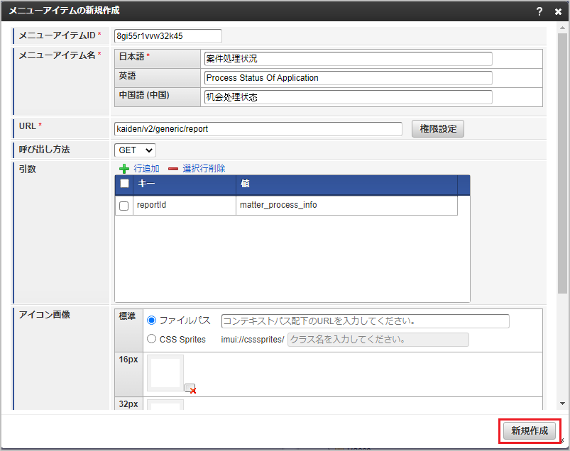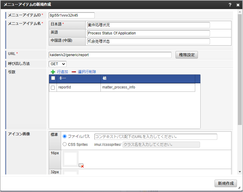 メニューアイテムID任意の値を設定してください。 メニューアイテム名任意の値を設定してください。 URLkaiden/v2/generic/report 引数