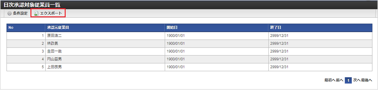 ヘッダー行出力有無エクスポートファイルのヘッダー行出力有無を選択します。 文字コードエクスポートファイルの文字コードを設定します。(UTF-8、SHIFT-JISなど) 区切り文字エクスポートファイルの区切り文字を設定します。(カンマ「,」、タブ「\t」) 囲み文字エクスポートファイルの囲み文字を設定します。(ダブルクォーテーション「”」) 「実行」ボタンをクリックすると、設定された検索条件で検索した結果をCSVファイルでダウンロードします。![]()
