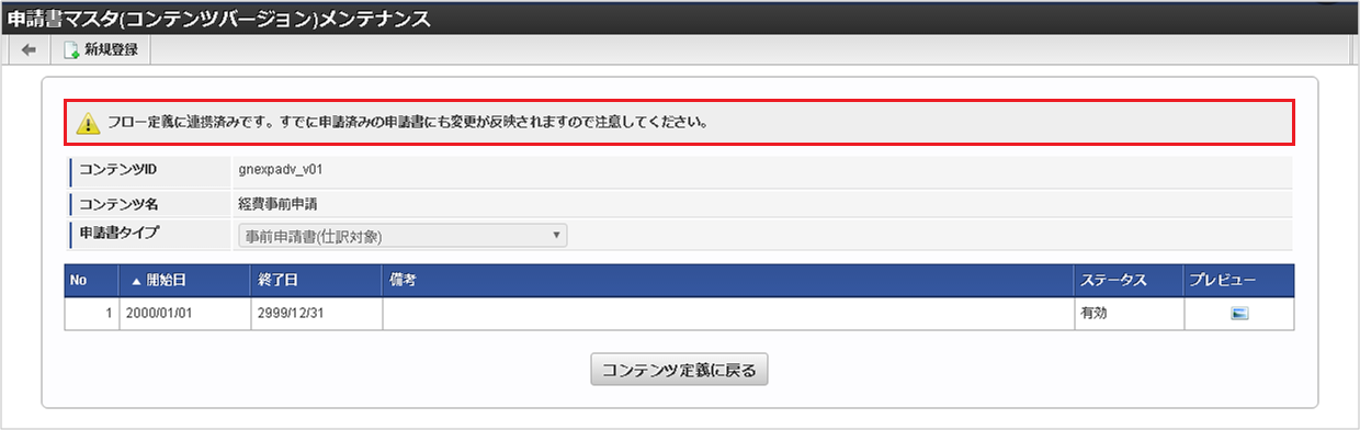 本項では、申請書マスタメンテナンス機能を利用したコンテンツの新規登録方法を説明します。コンテンツバージョン設定の詳細は、コンテンツバージョン設定時の操作方法を参照してください。